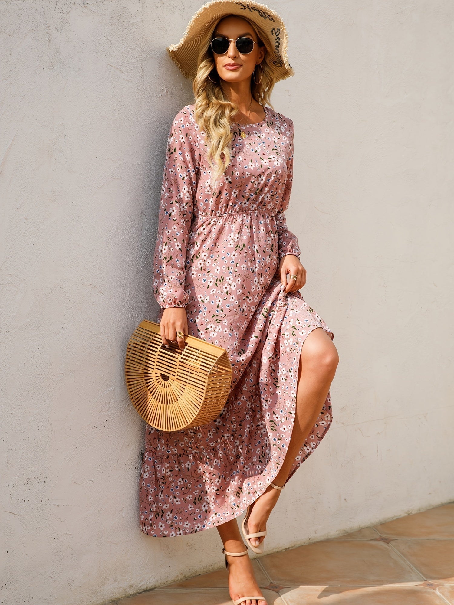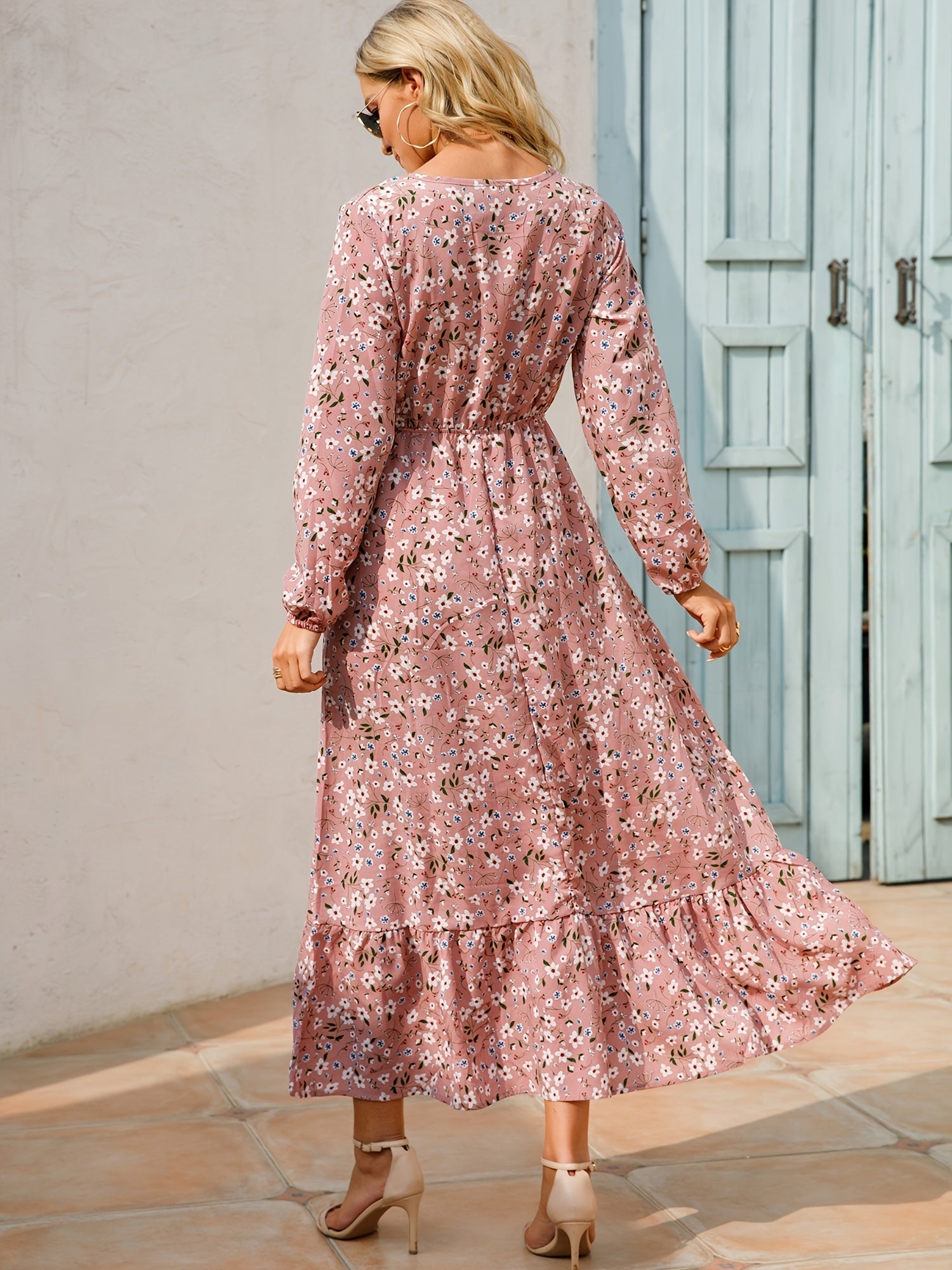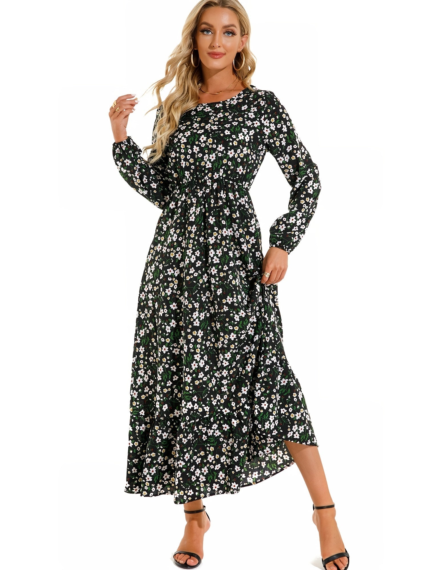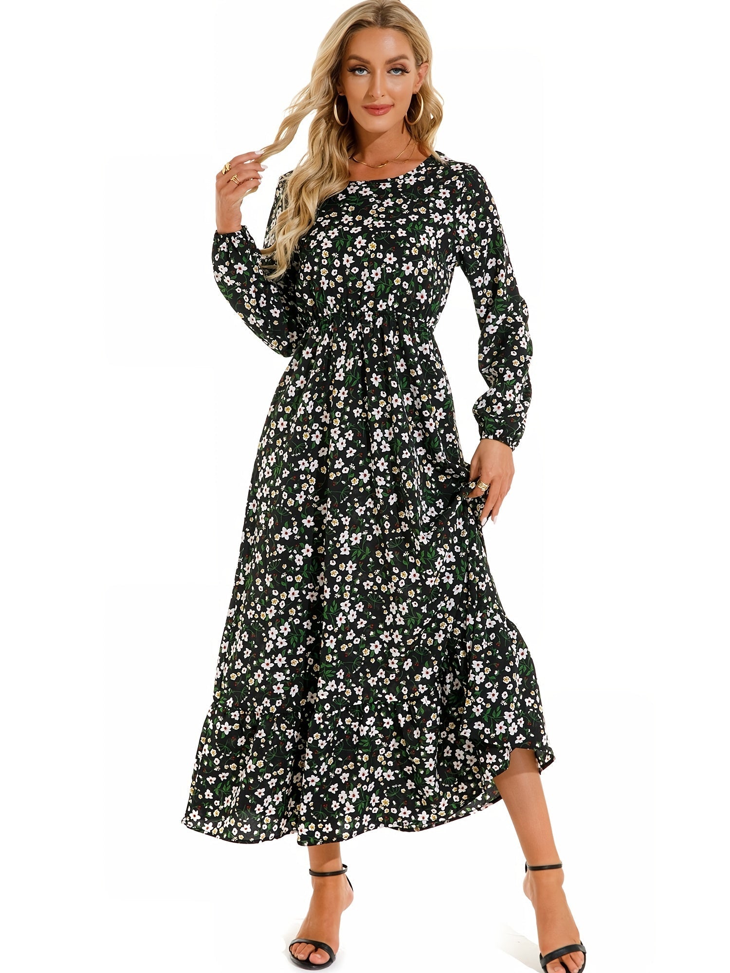 Sale Bohemian Flowy Ruffle Long Dress, Casual Floral Print Long Sleeve Crew Neck Waist Long Dresses