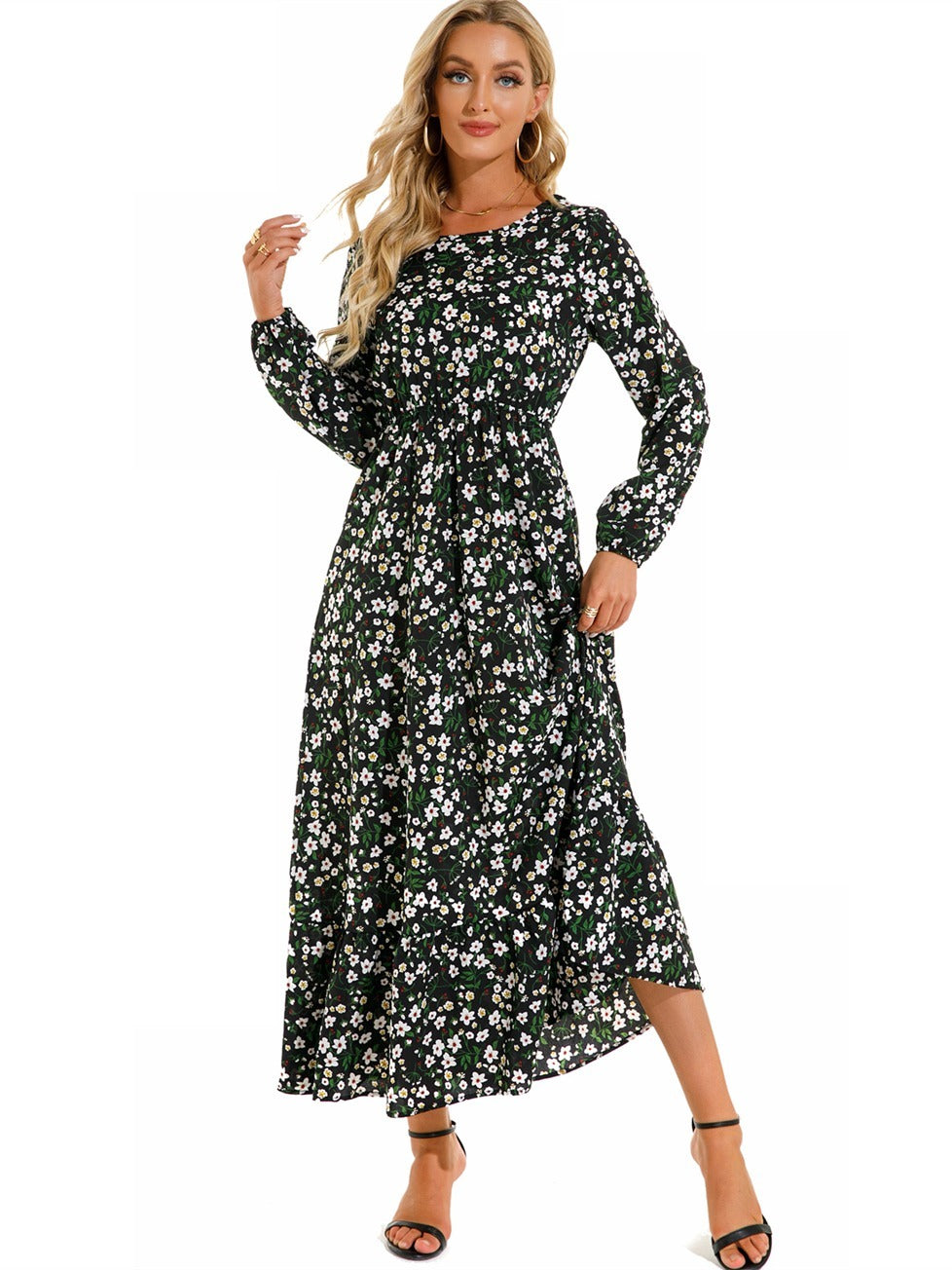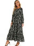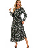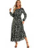 Bohemian Flowy Ruffle Long Dress, Casual Floral Print Long Sleeve Crew Neck Waist Long Dresses