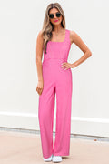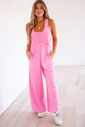 - This pink jumpsuit is chic and comfy in style.Designed with a mineral wash and terry knit material.This jumpsuit features a relaxed fit, front pockets and a racerback design.This sleeveless jumpsuit is a staple perfect for any casual occasion.