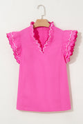 - The layered v neck and ruffled short sleeves this blouse unique and feminine.It features scalloped detailing on the neck and sleeves.It’s loose fit for any body shapes.Lightweight and comfy for all day wearing.
