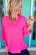 Sale Bright Pink Frilled V Neckline Bracelet Sleeve Crinkled Blouse