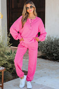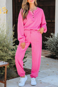 Bright Pink Raw Edge Half Buttons Pullover and Jogger Pants Set