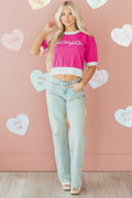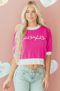 Bright Pink XOXO Embroidered Graphic Valentines Contrast Trim Crew Neck Short Puff Sleeve Sweater Tee
