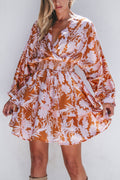 Sale Pink Bohemian Floral Print Tassel Tie Long Sleeve Flowy Mini Dress