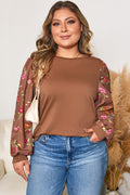 Sale Brown Floral Sleeve Patchwork Round Neck Plus Blouse
