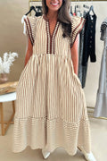 Brown Stripe Double Ruffled Short Sleeve Contrast Trim V Neck Midi Dress