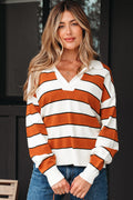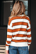 Brown Stripe Ribbed Polo Collar Drop Shoulder Sweater