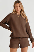 Brown Textured Long Sleeve Top and Drawstring Shorts Set