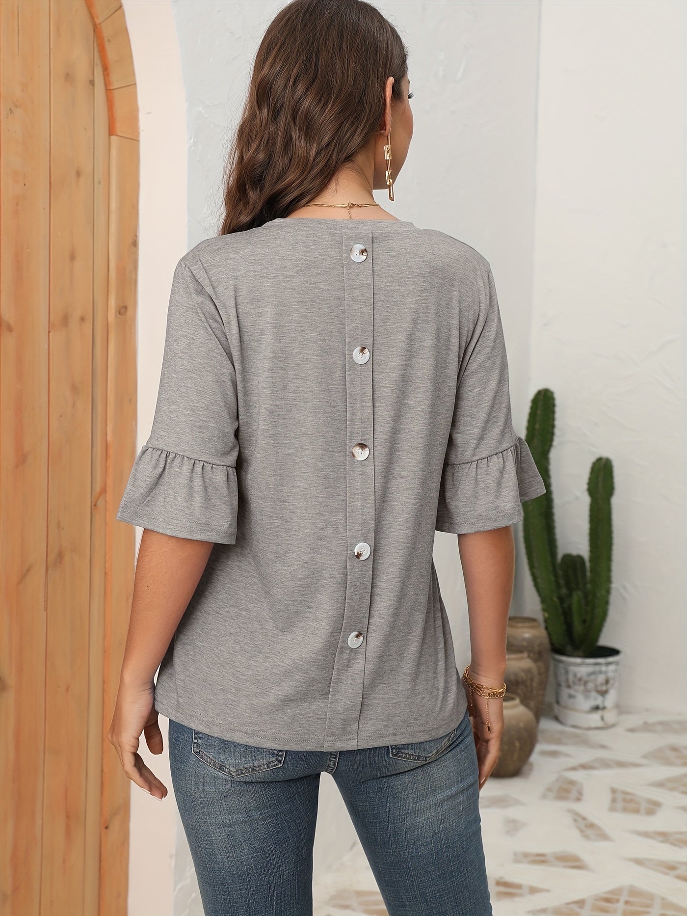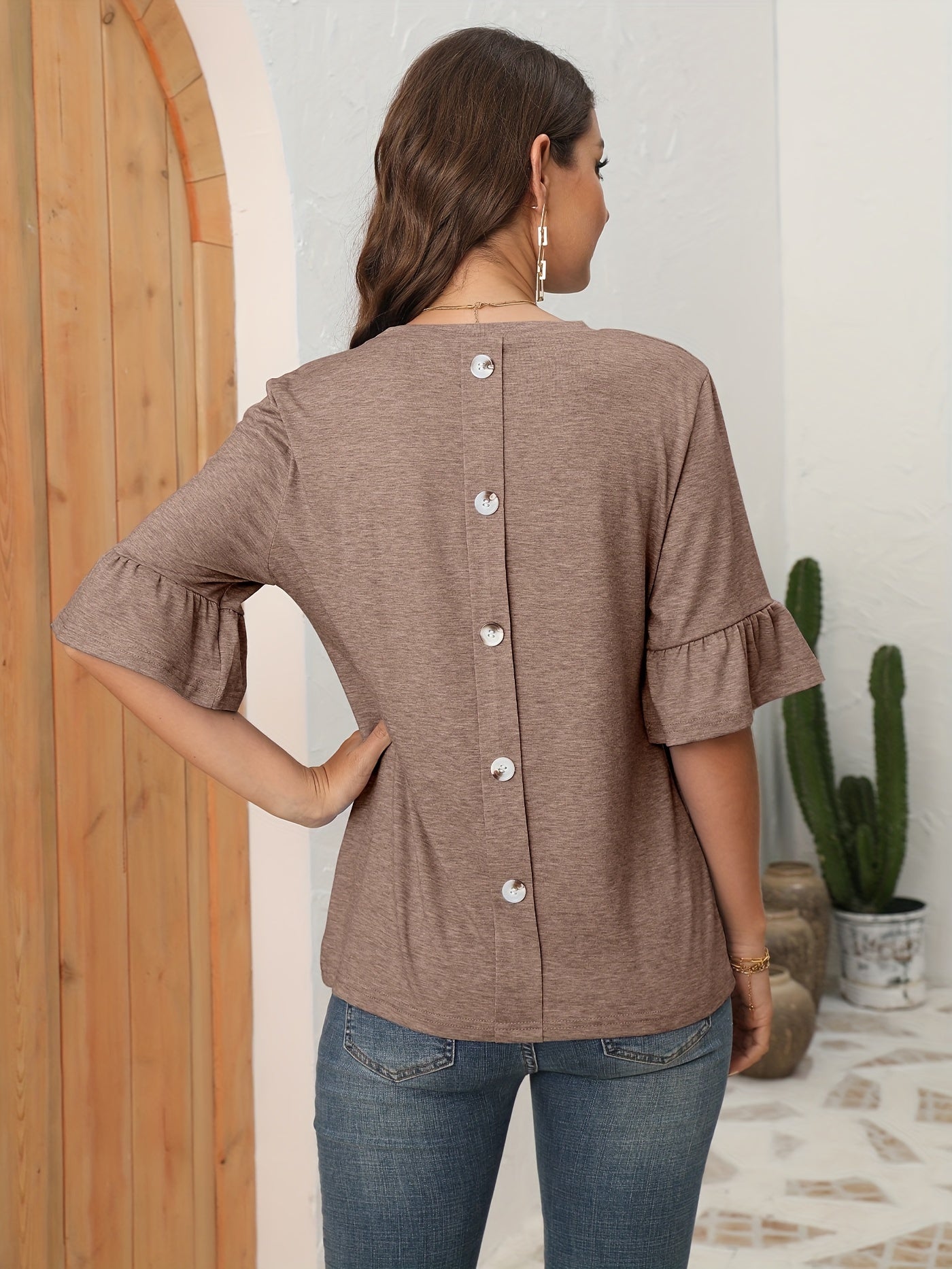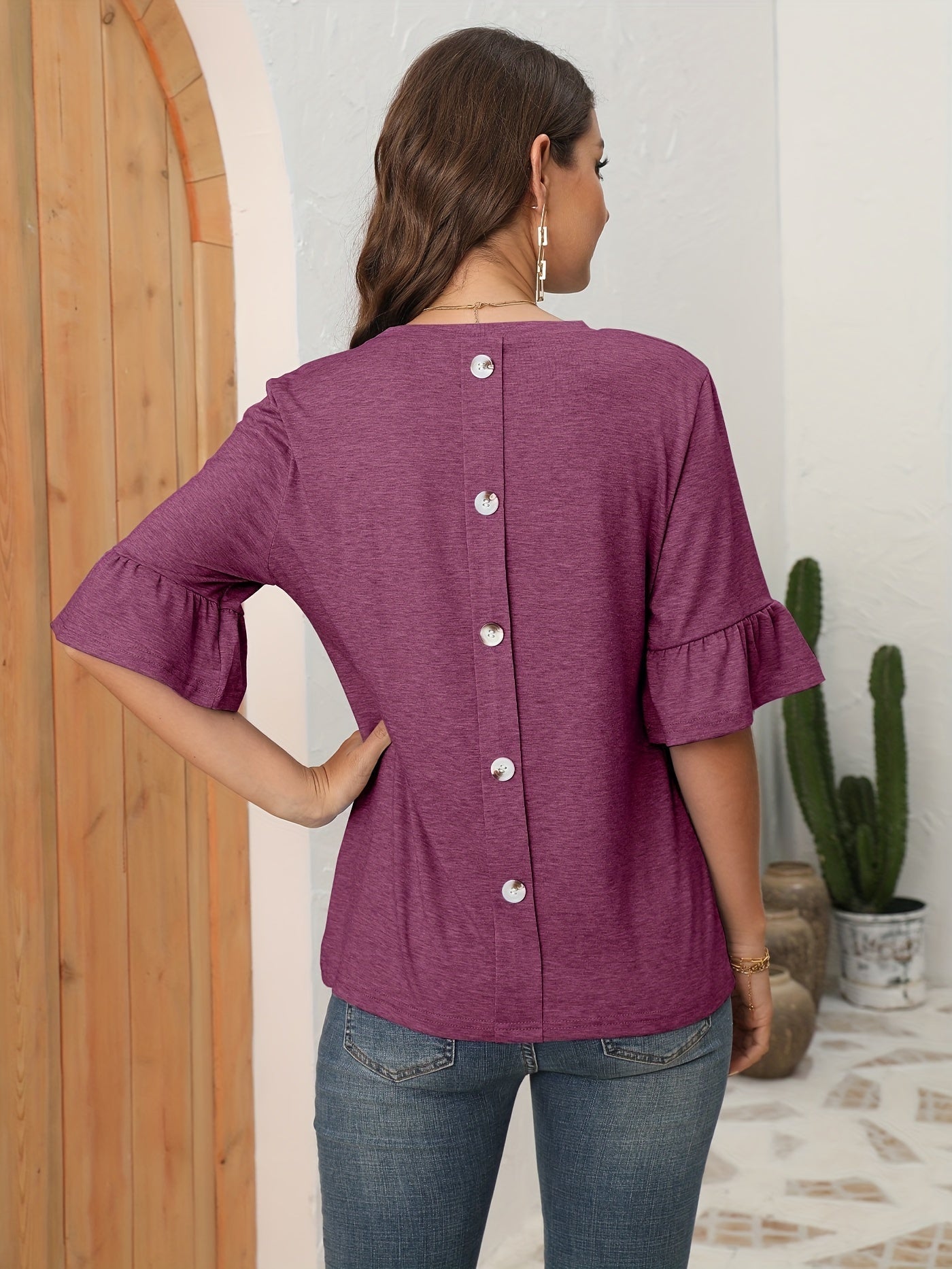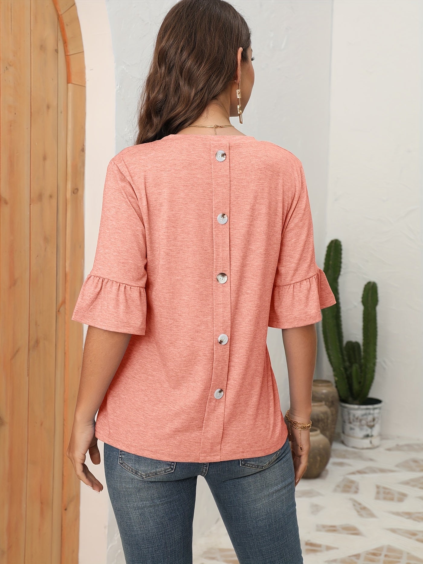 Button Back Solid T-shirt, Casual Crew Neck Half Sleeve T-shirt