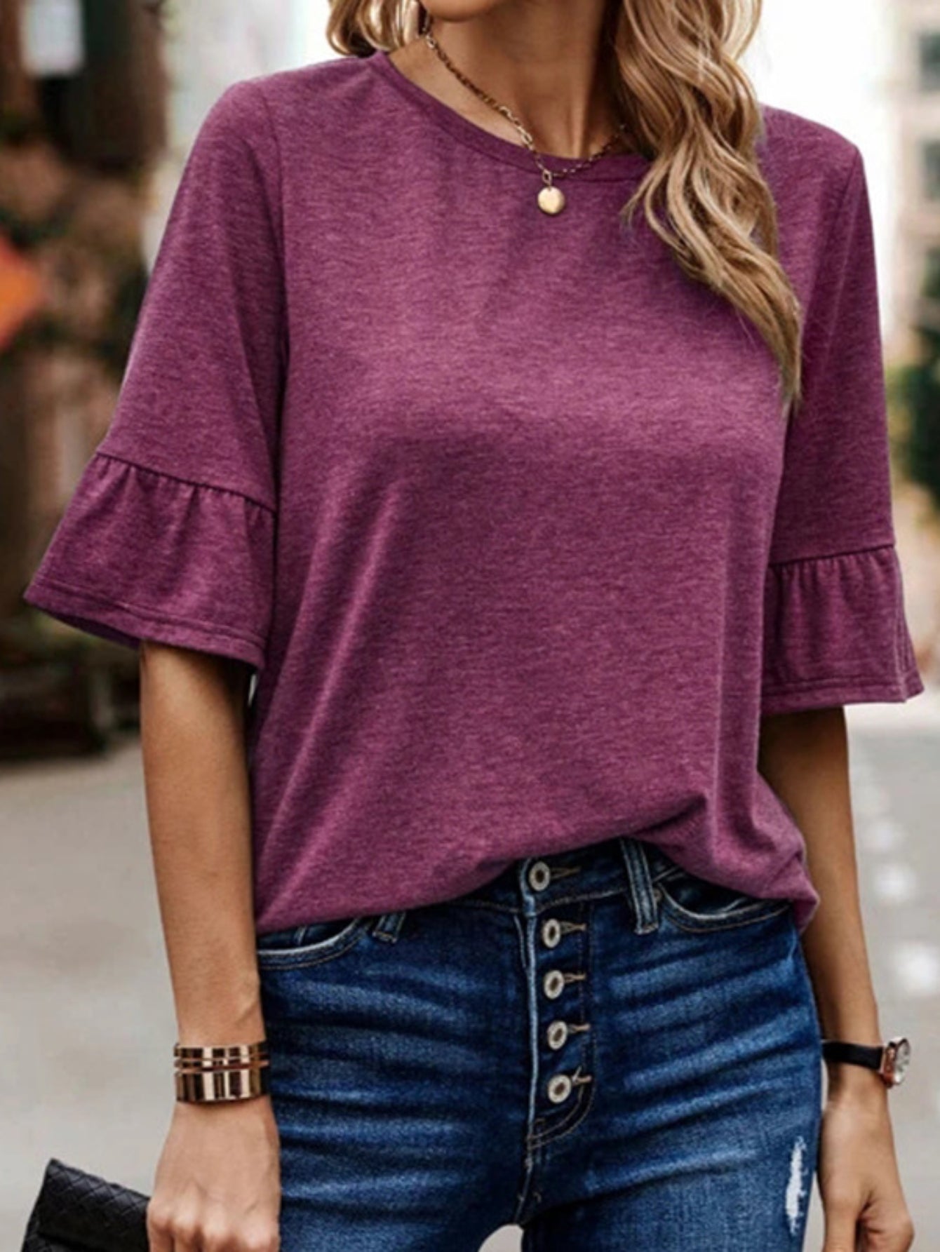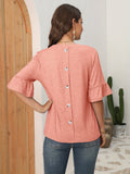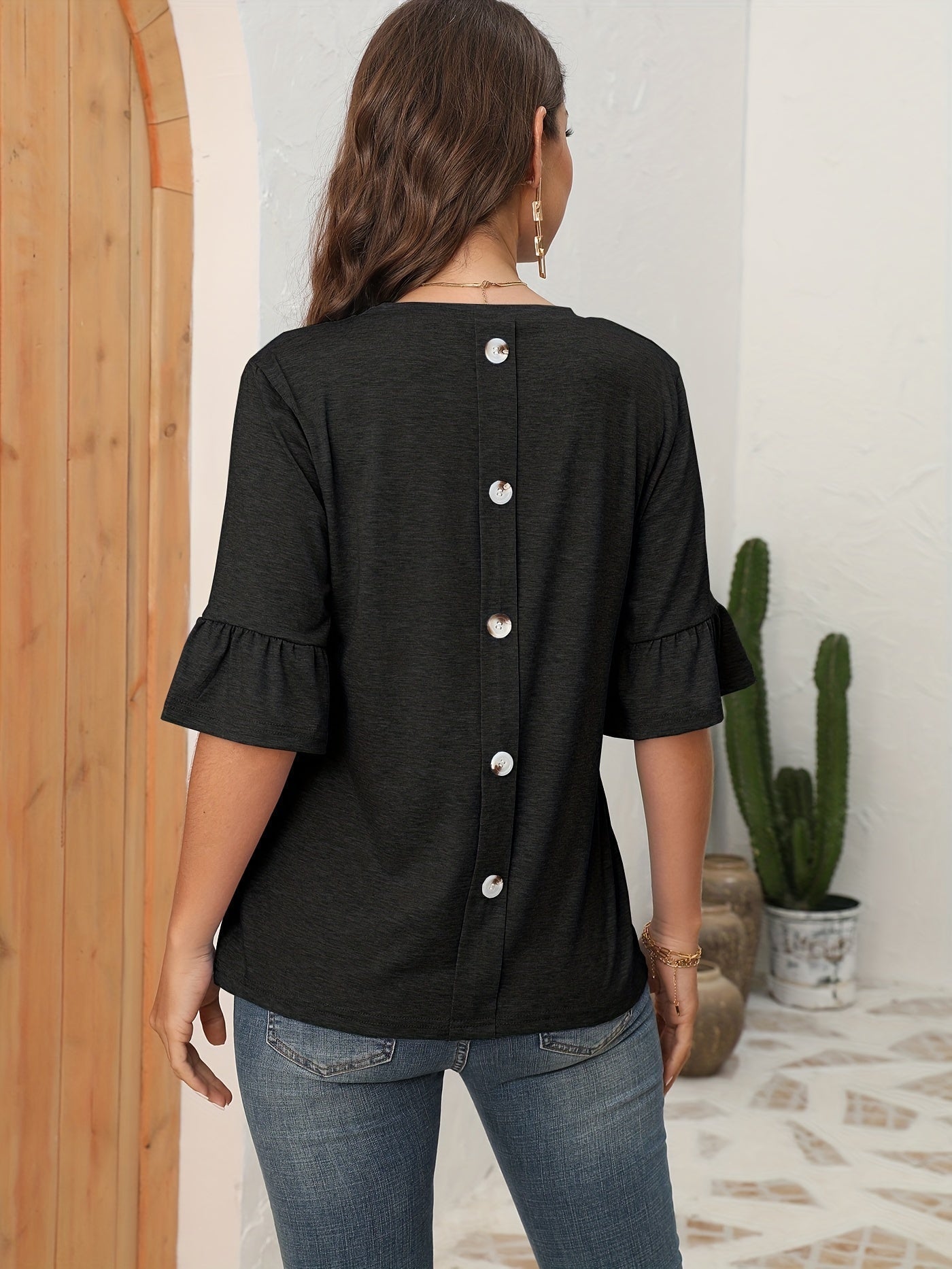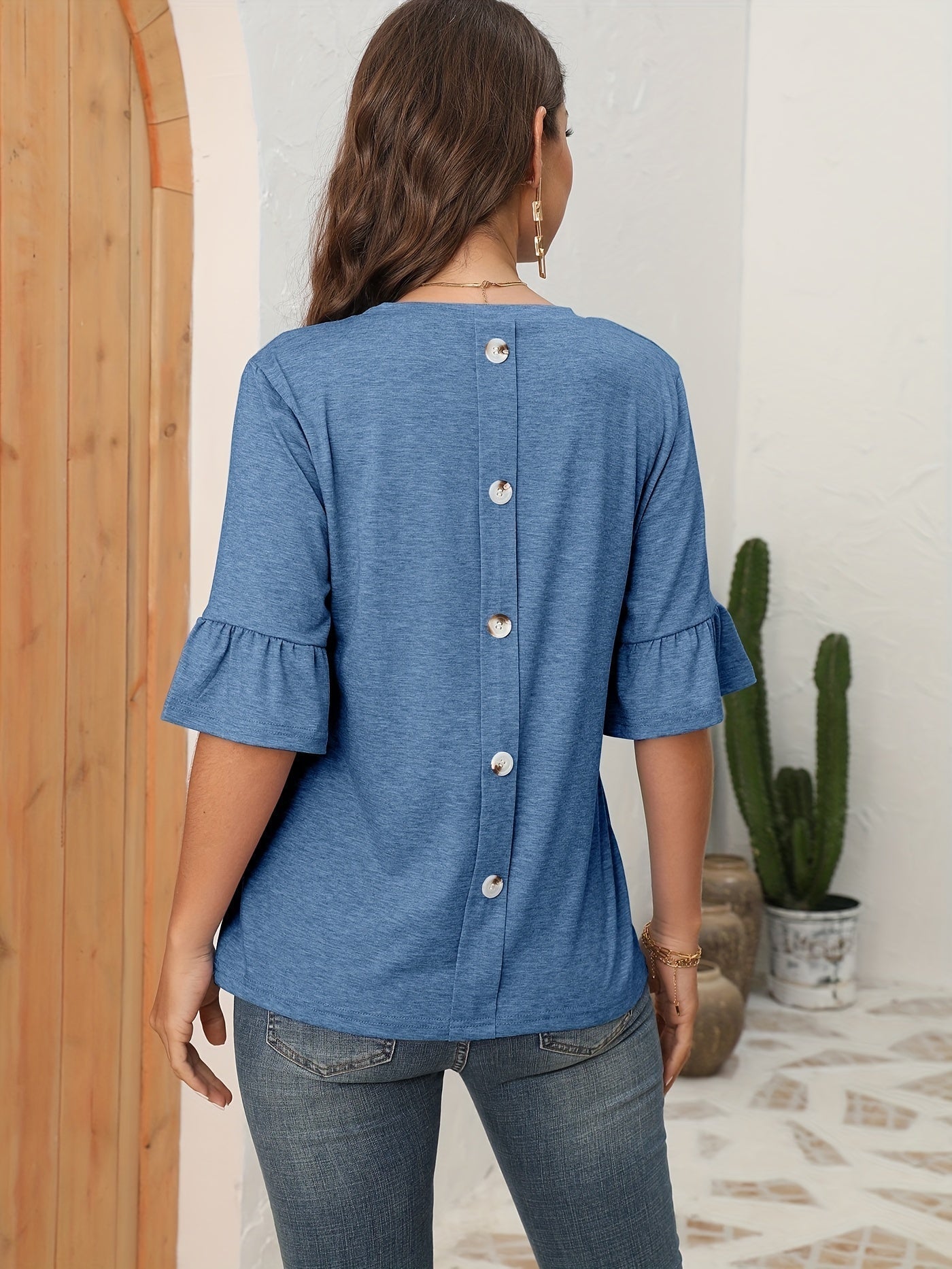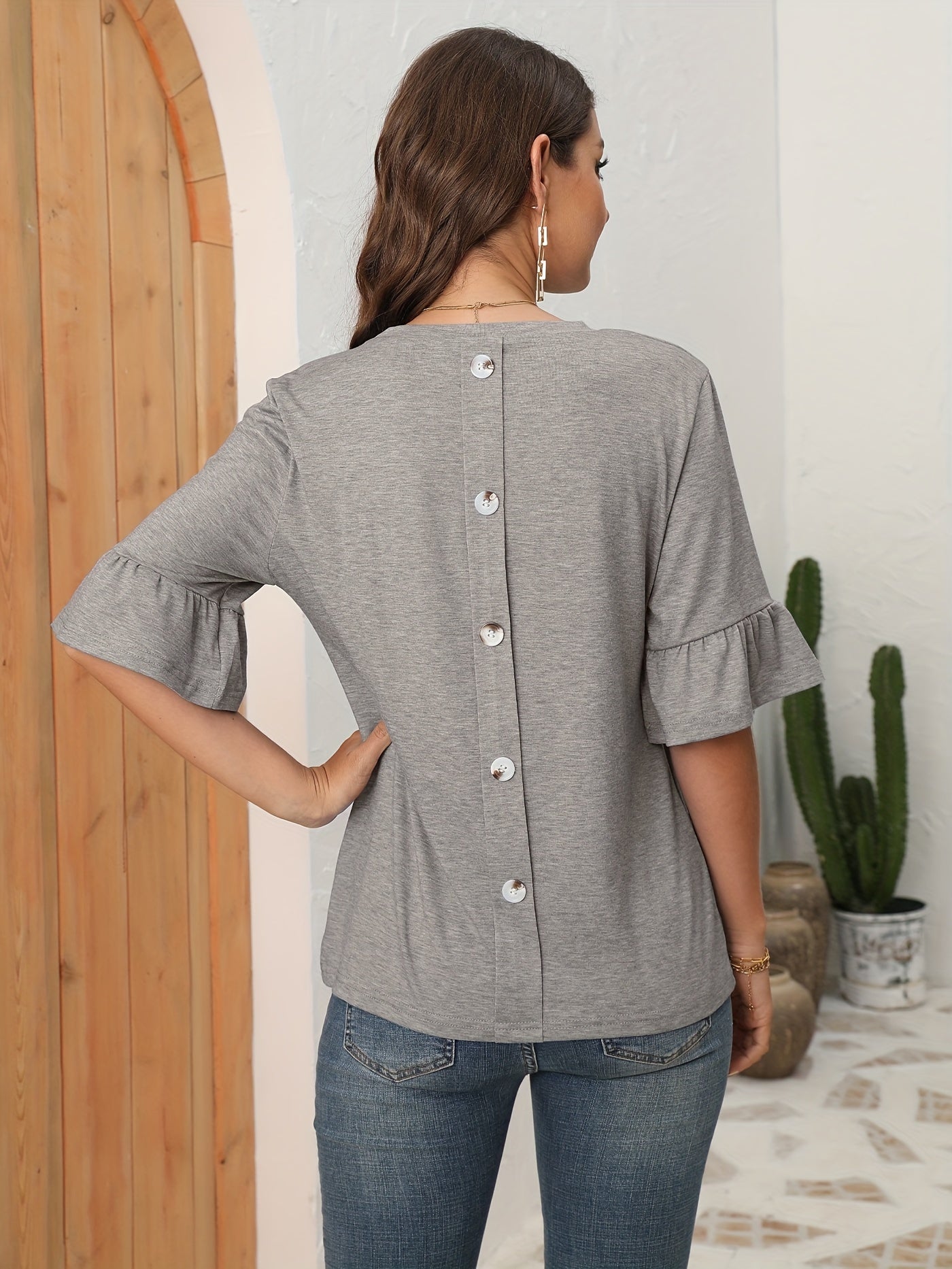 Button Back Solid T-shirt, Casual Crew Neck Half Sleeve T-shirt