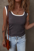 Carbon Grey Ribbed Knit Colorblock Edge U Neck Slim Fit Tank Top