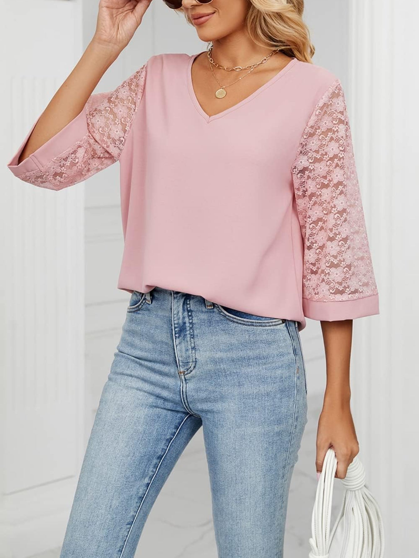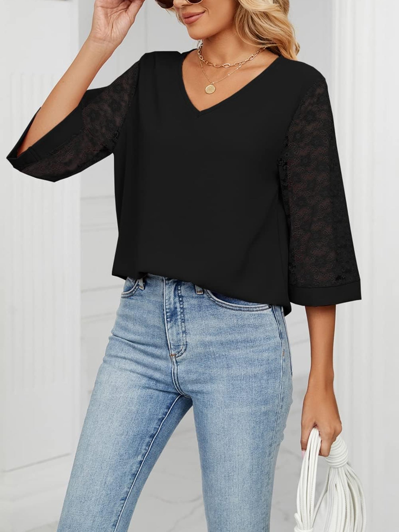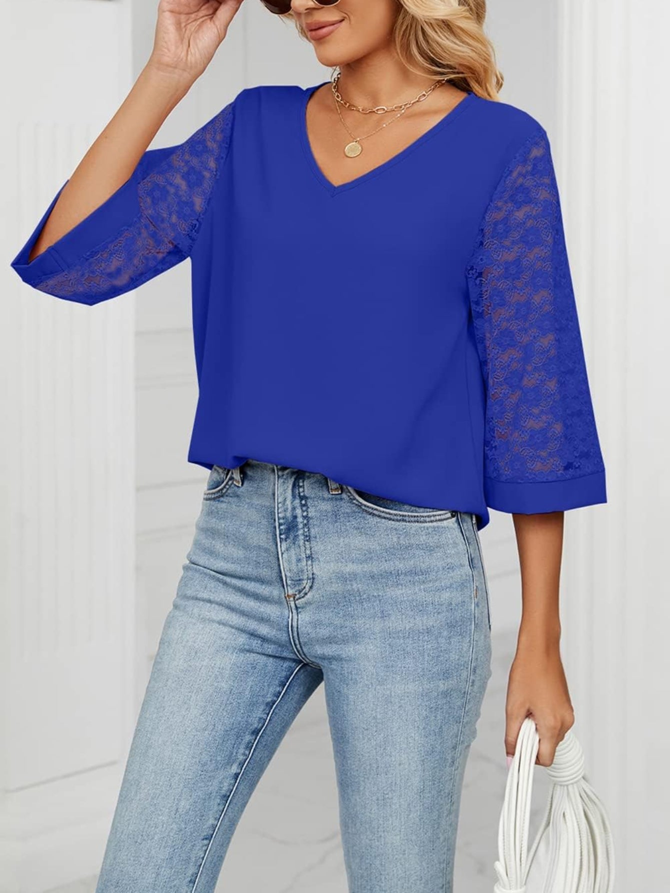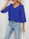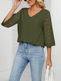 Casual 3/4 Sleeve Lace Chiffon Solid T-Shirt