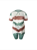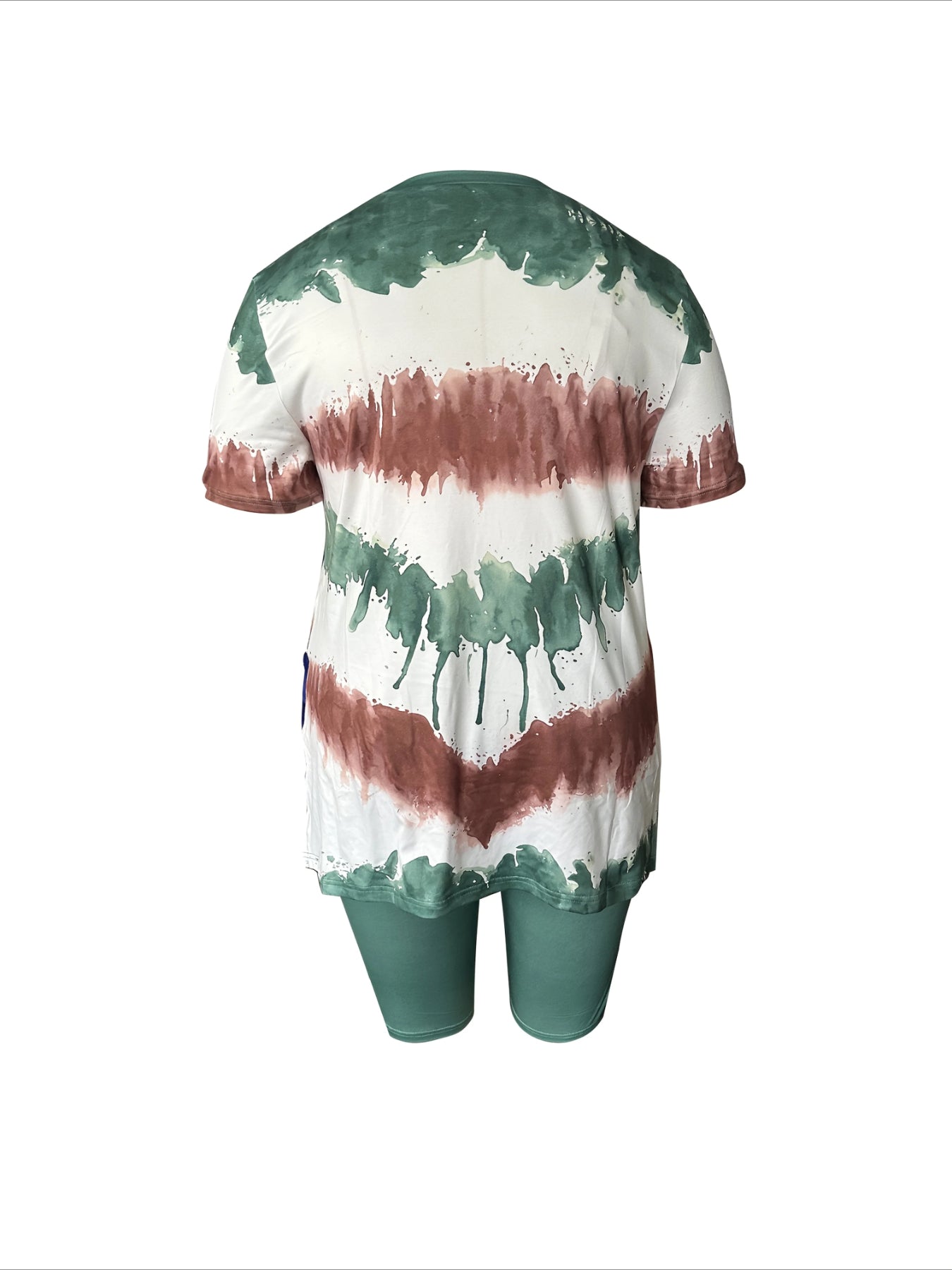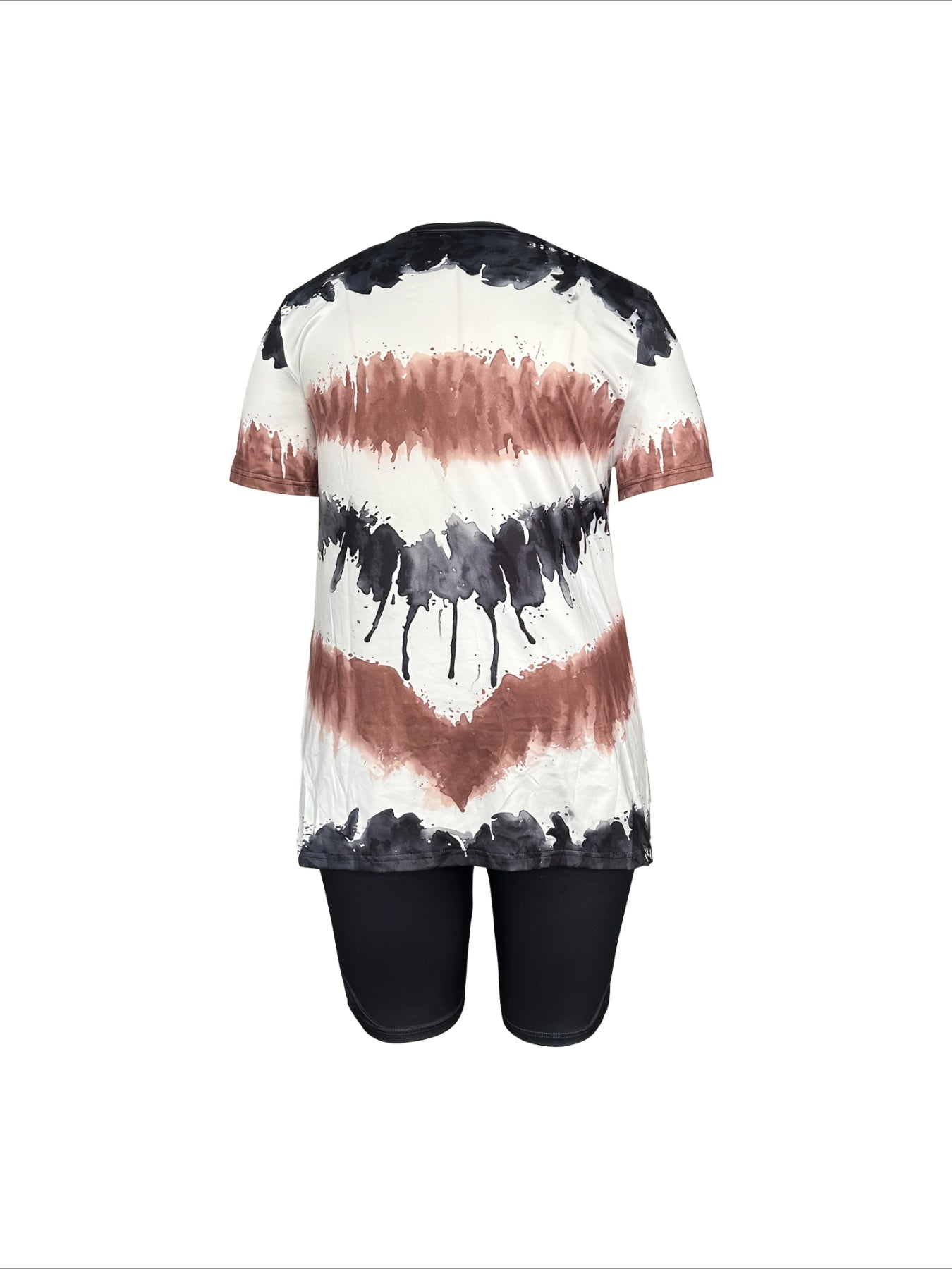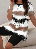 Casual Two-Piece Set Color Block Print Short Sleeve Top With Side Slit & High-Waisted Shorts