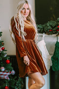 Chestnut Velvet Frilled Neck Gigot Sleeve Swing Dress