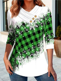 Christmas Tree Print Button Decor T-shirt, Casual Long Sleeve Plaid Print T-shirt