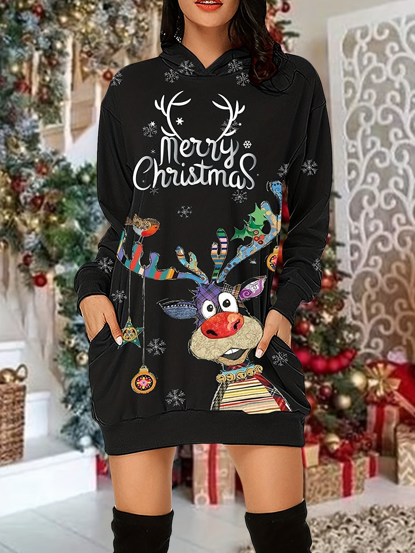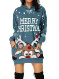 Christmas Print Casual Hoodie Dress Long Sleeve Hooded Dress