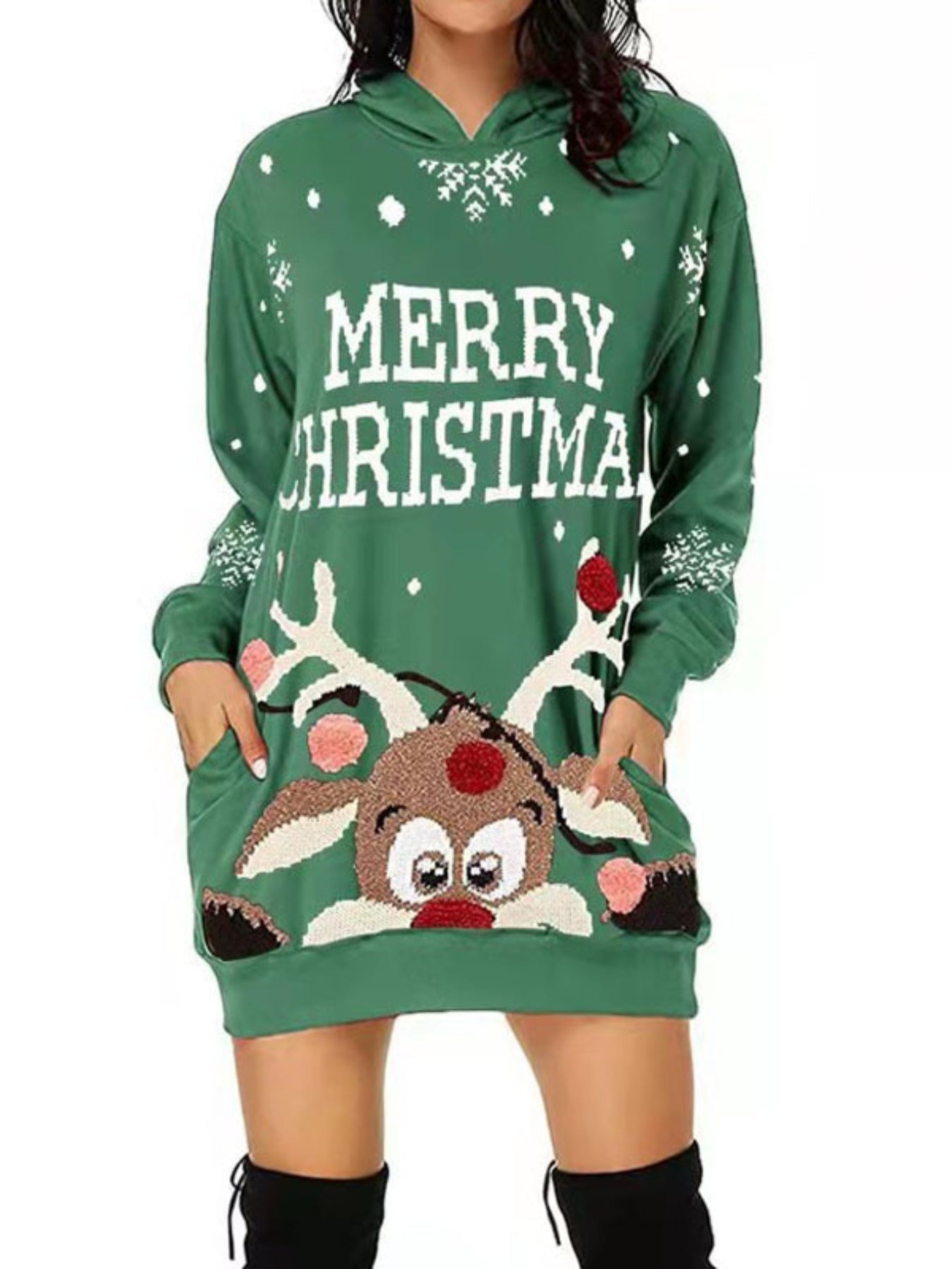 Sale Christmas Print Casual Hoodie Dress Long Sleeve Hooded Dress