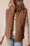 Coffee Corduroy Stand Neck Zipped Puffer Vest