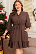 Coffee Plus Size Frilled Trim V Neck Puff Sleeve Textured Mini Dress