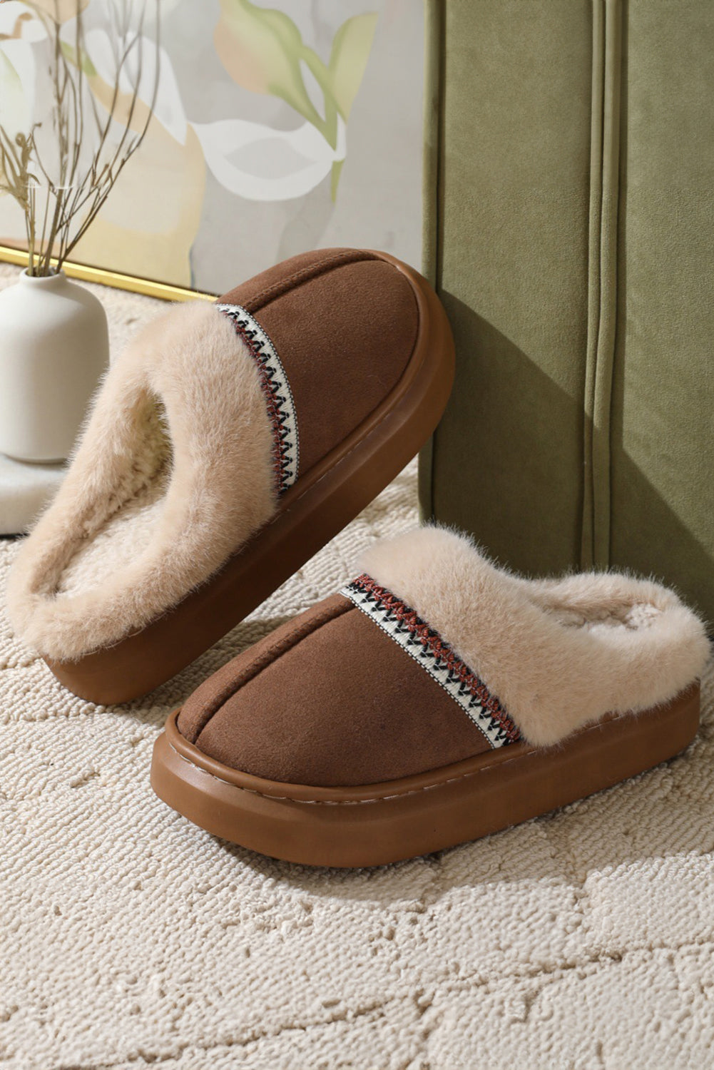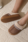 Coffee Western Woven Detail Faux Suede Furry Home Slippers
