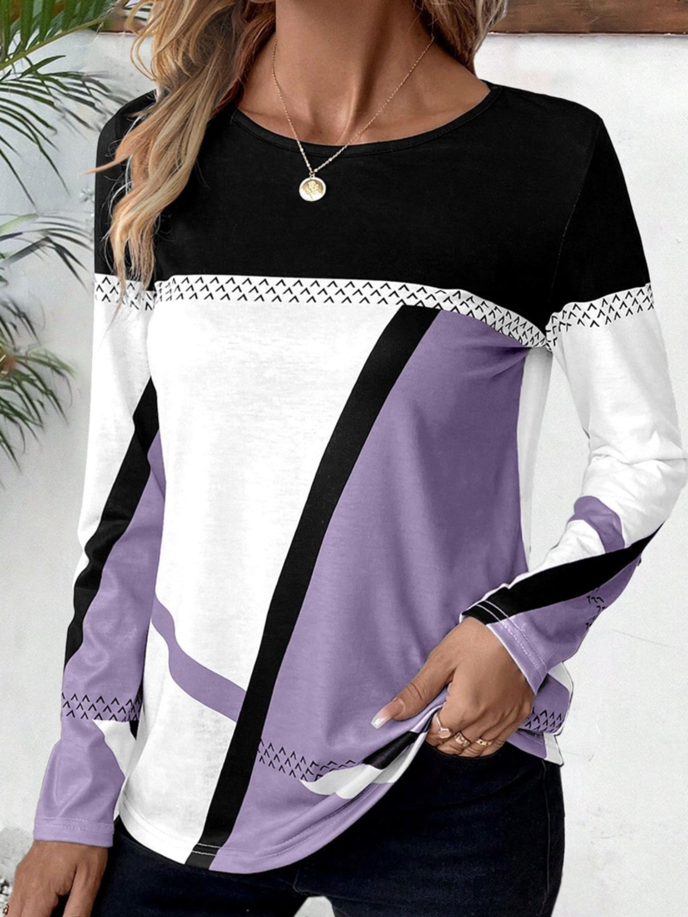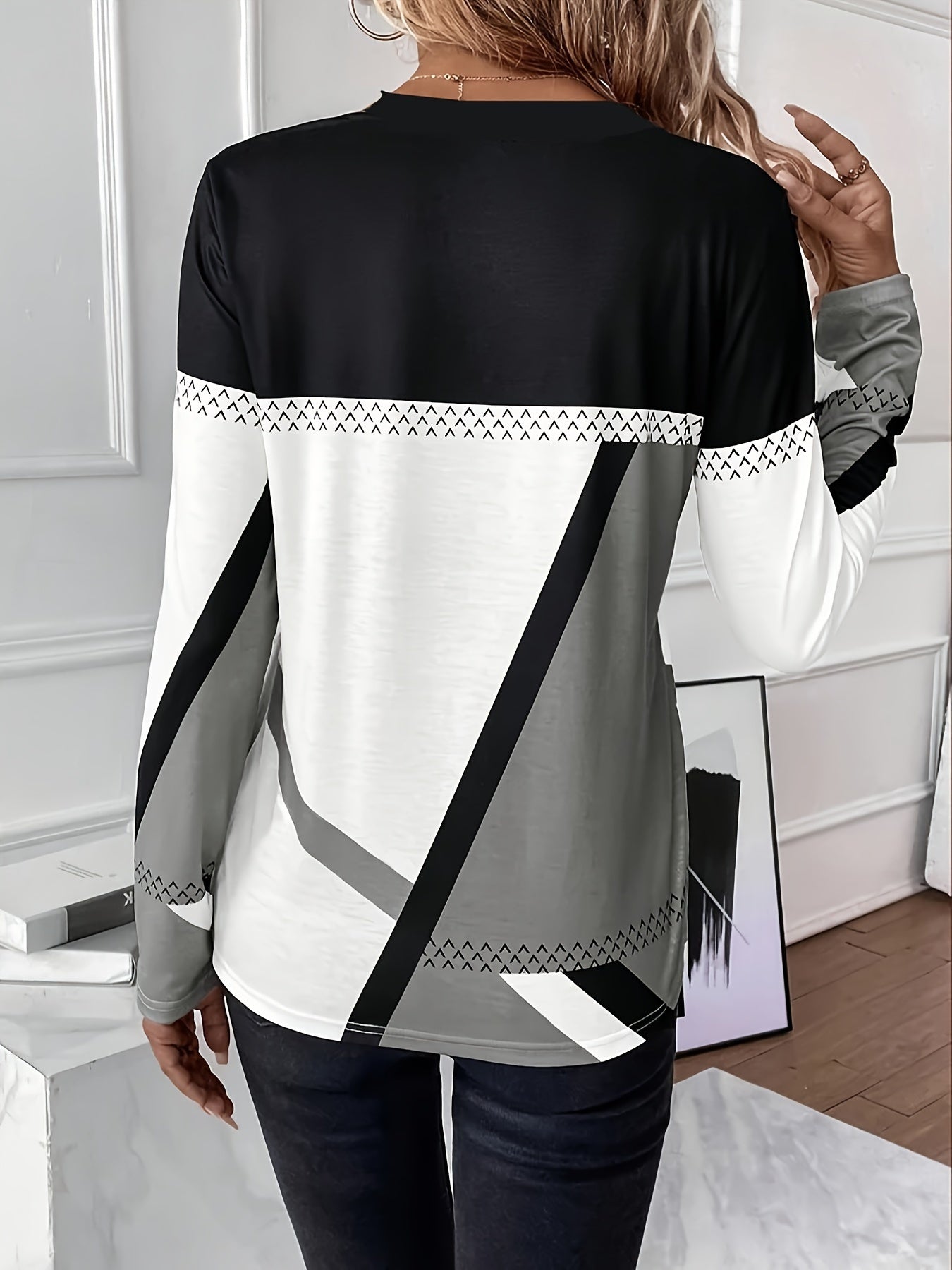 Sale Button Geometric Print Long Sleeve T Shirt