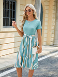 Sale Vintage Round Neck Knit Dress with Waist Tie, Polyester & Elastane