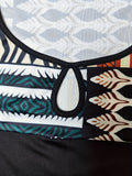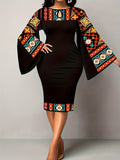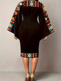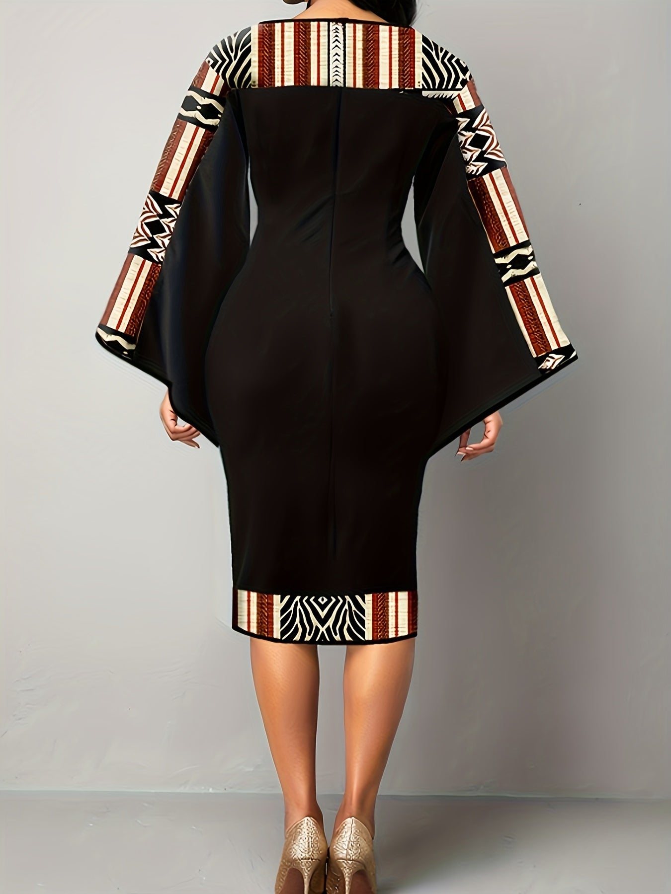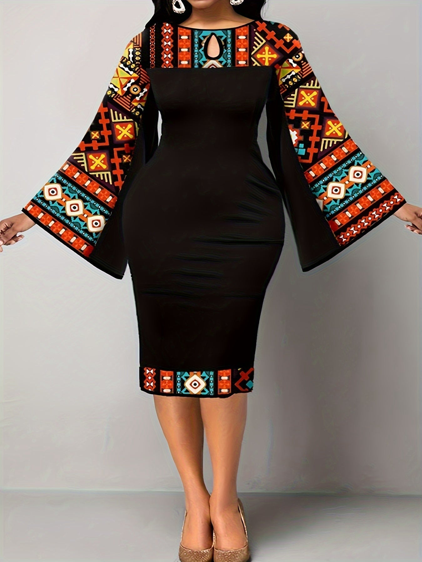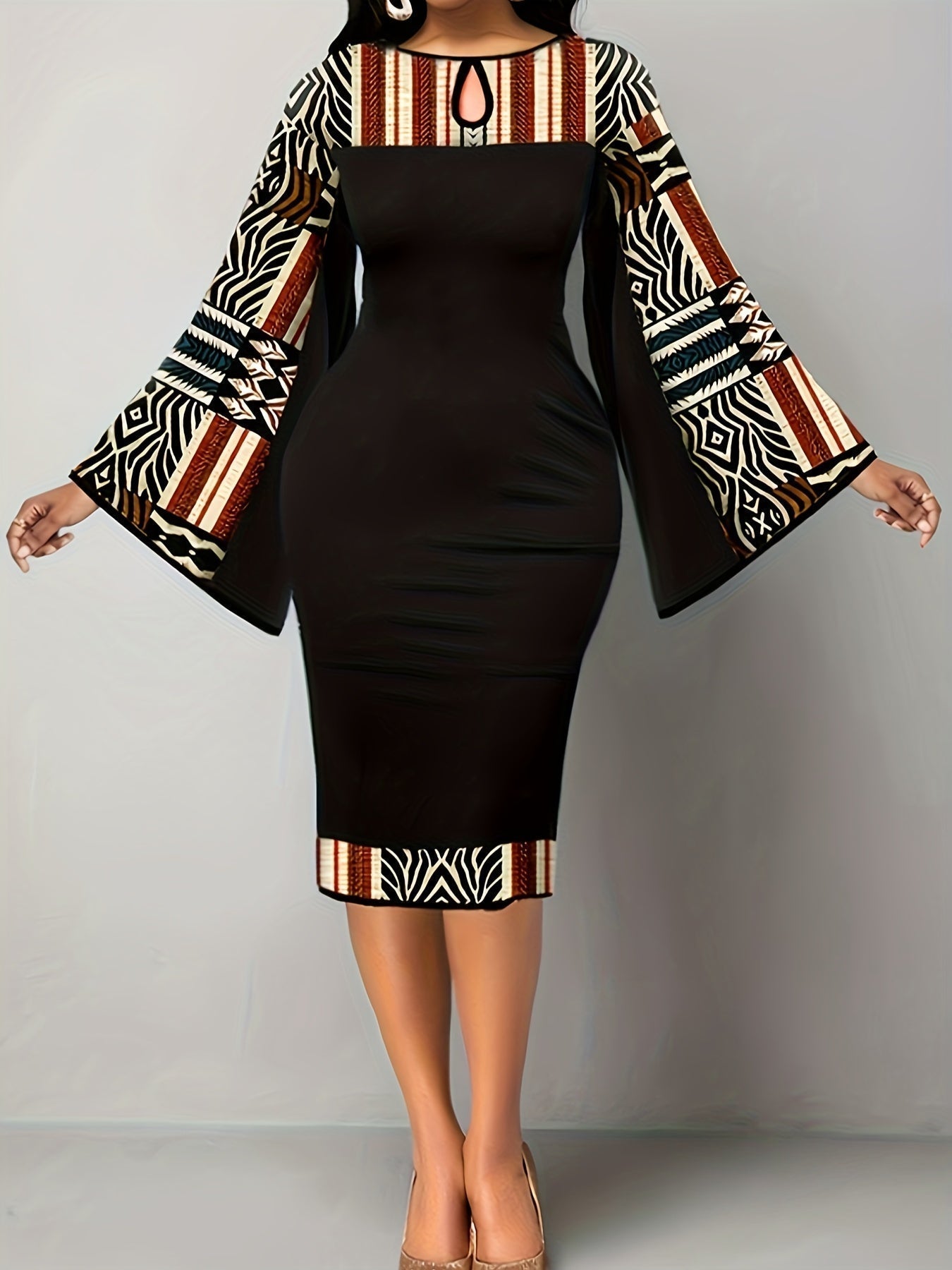 Colorblock Geometric Print Bell Sleeve Round Neck Keyhole Midi Dress