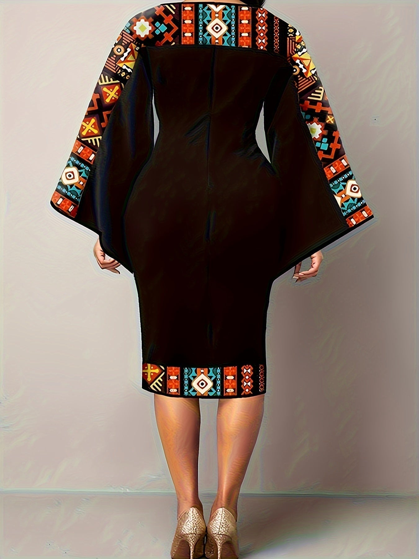 Sale Colorblock Geometric Print Bell Sleeve Round Neck Keyhole Midi Dress