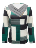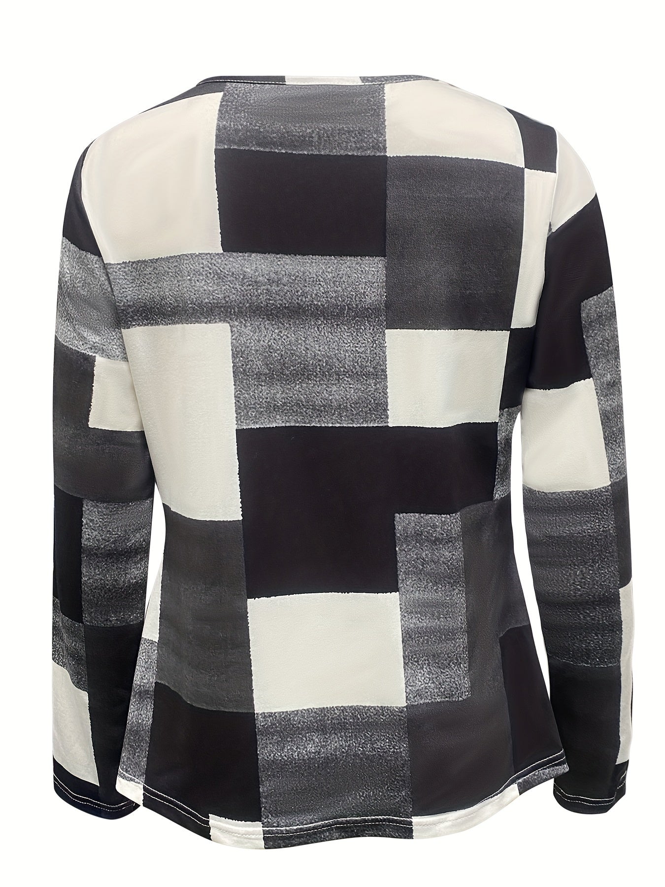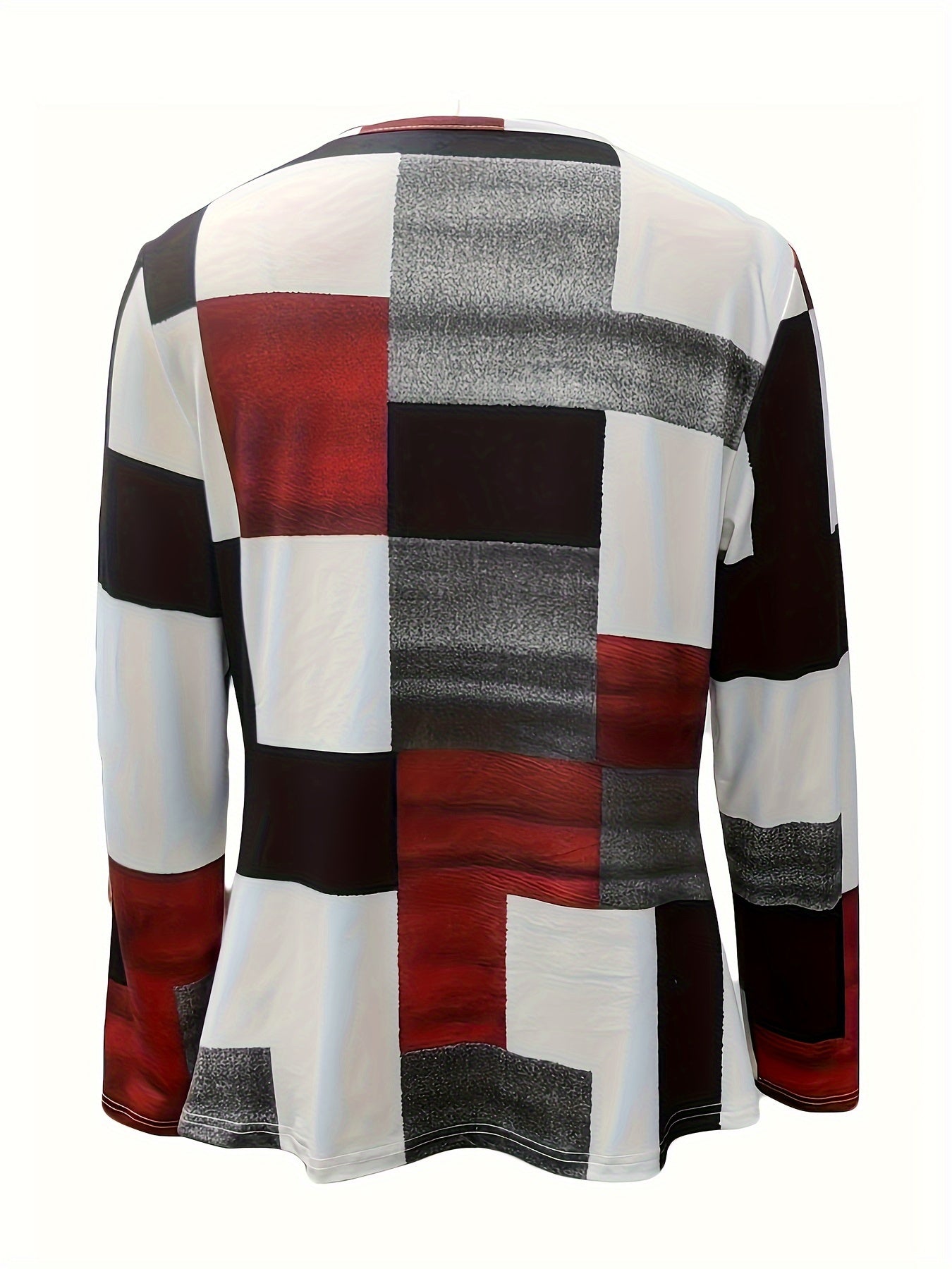 Colorblock Print Ruched T-Shirt, Casual Long Sleeve Top