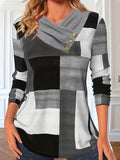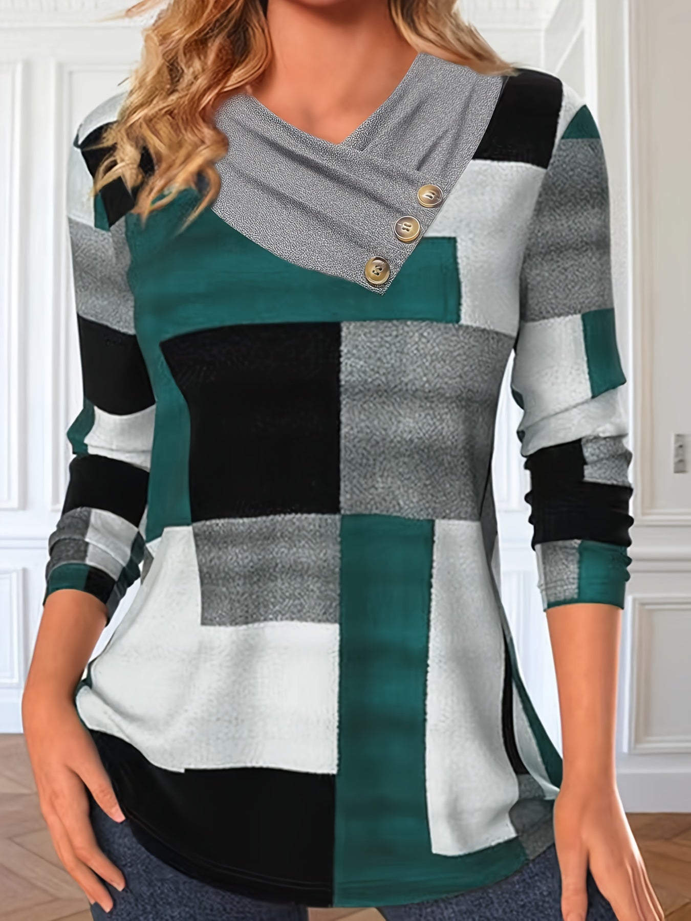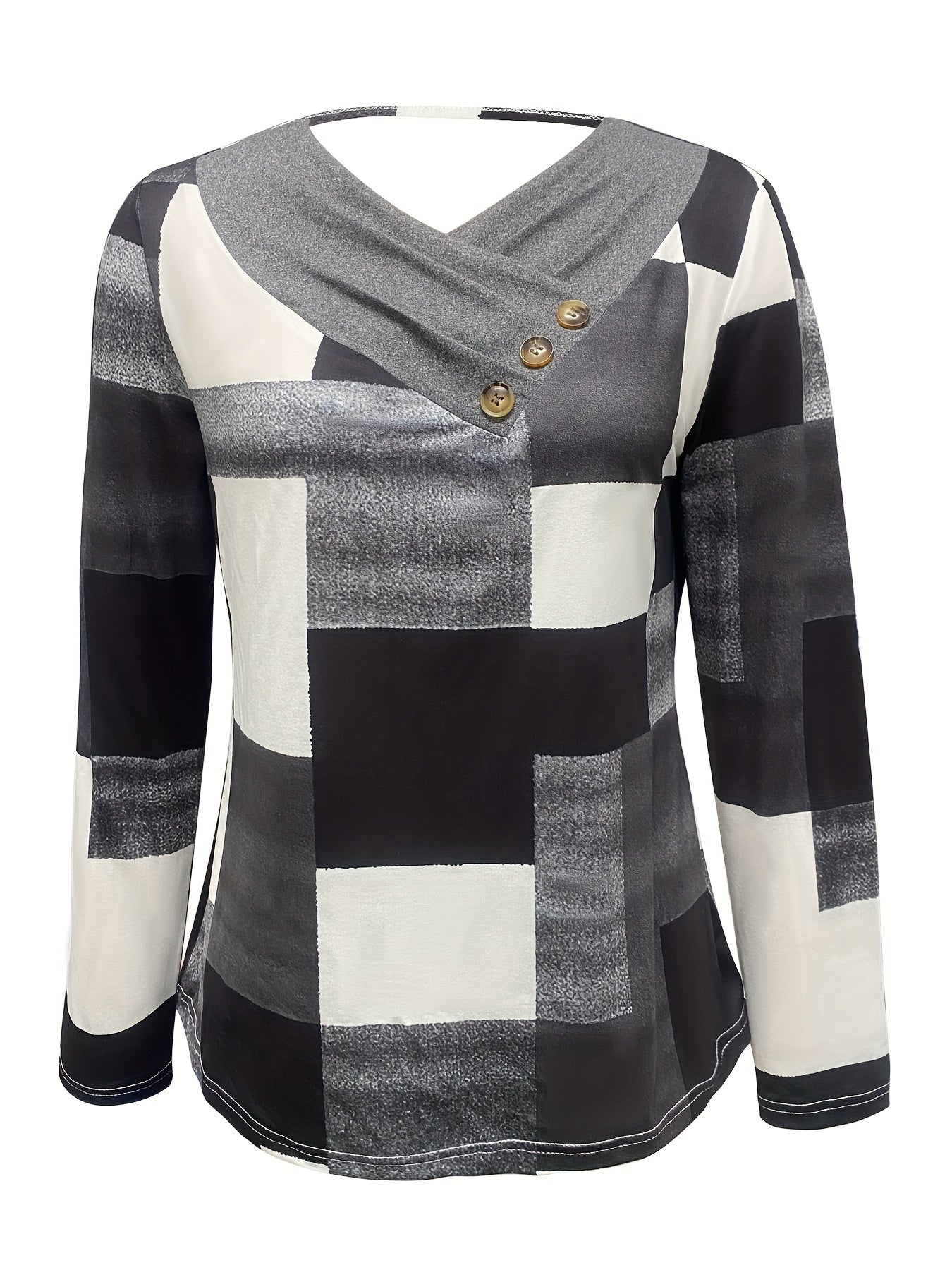 Christmas Tree Print Button Decor T-shirt, Casual Long Sleeve Plaid Print T-shirt