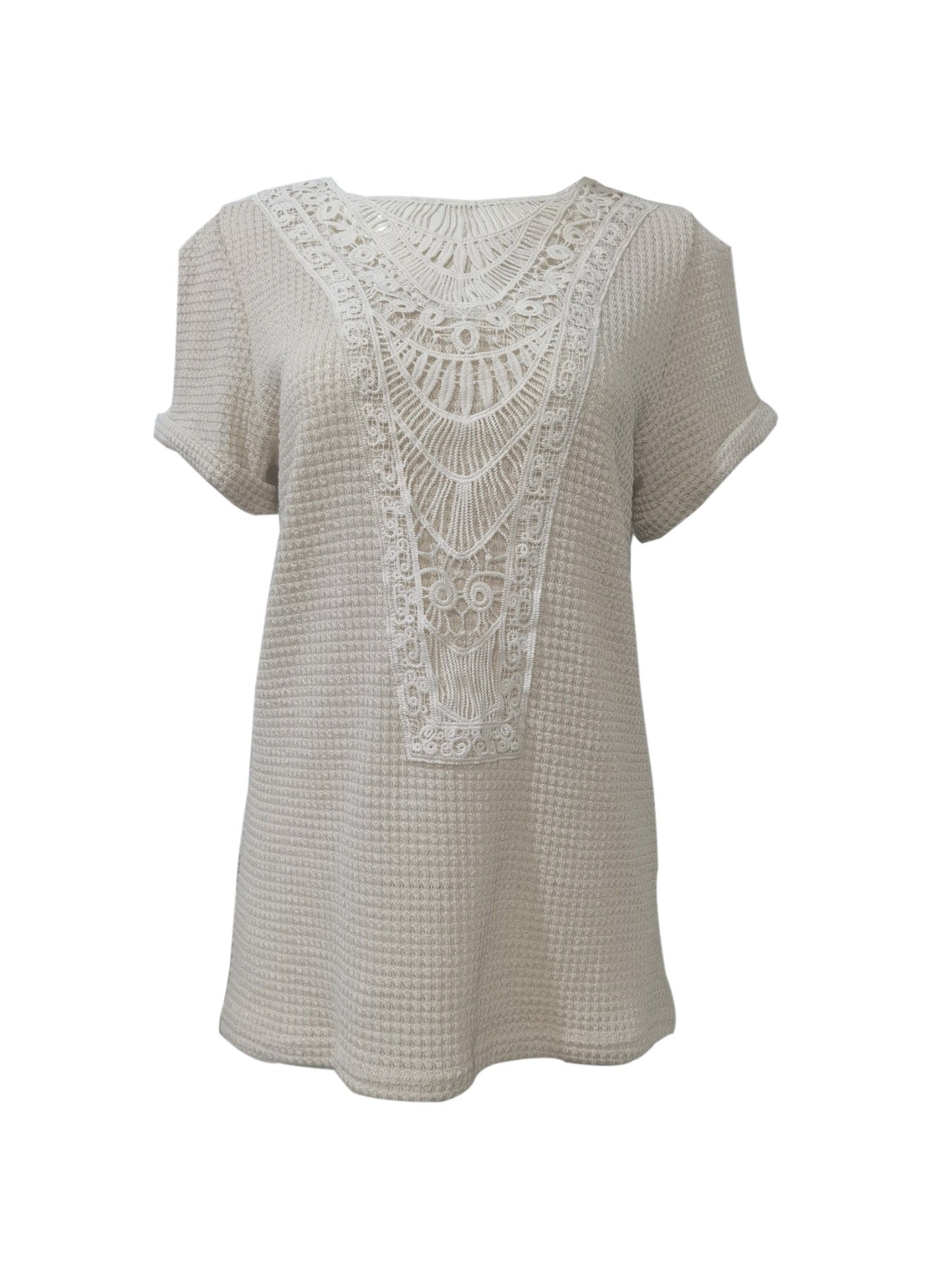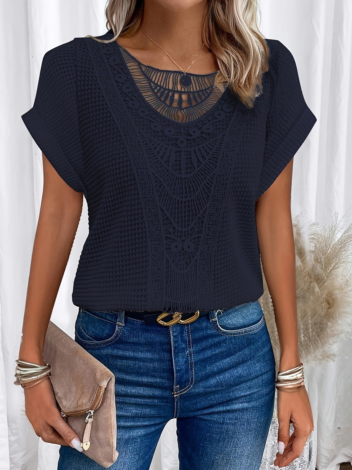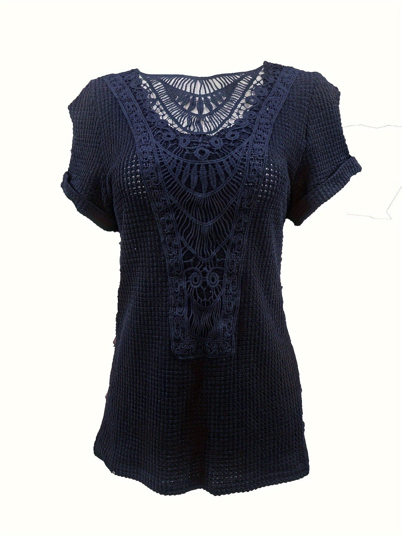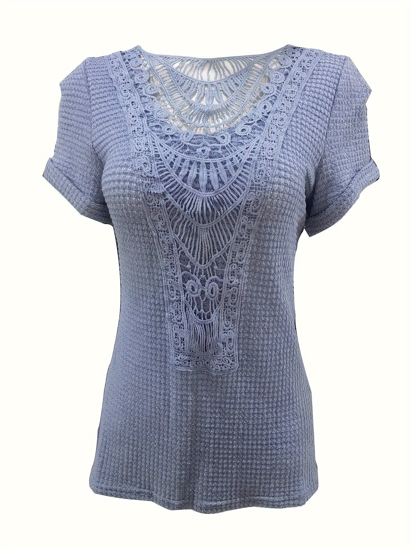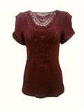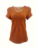 Contrast Lace Crew Neck T-Shirt, Casual Short Sleeve T-Shirt