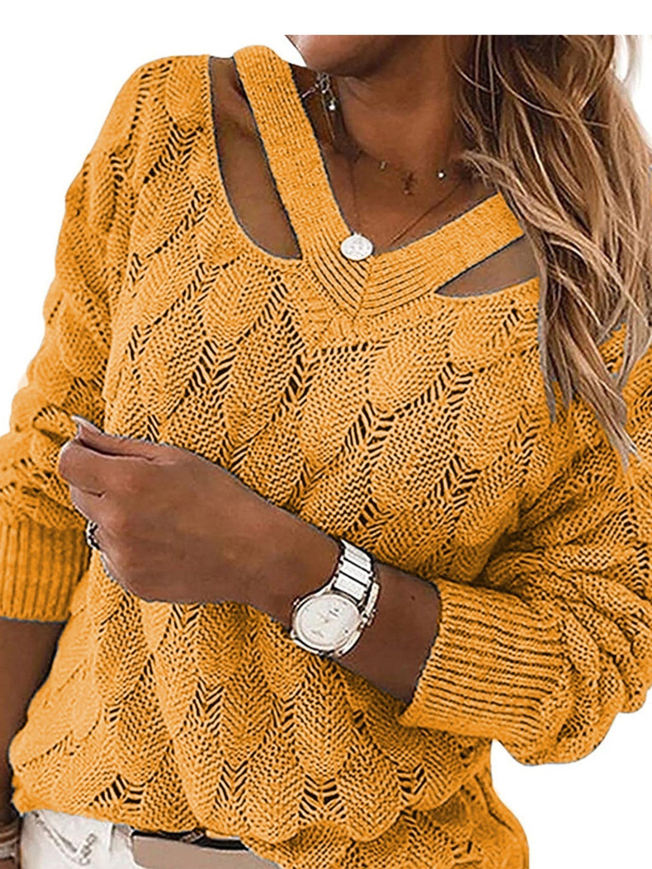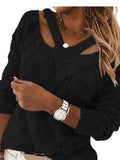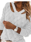 Sale Cut Out Solid Knit Sweater, Casual V Neck Long Sleeve Sweater