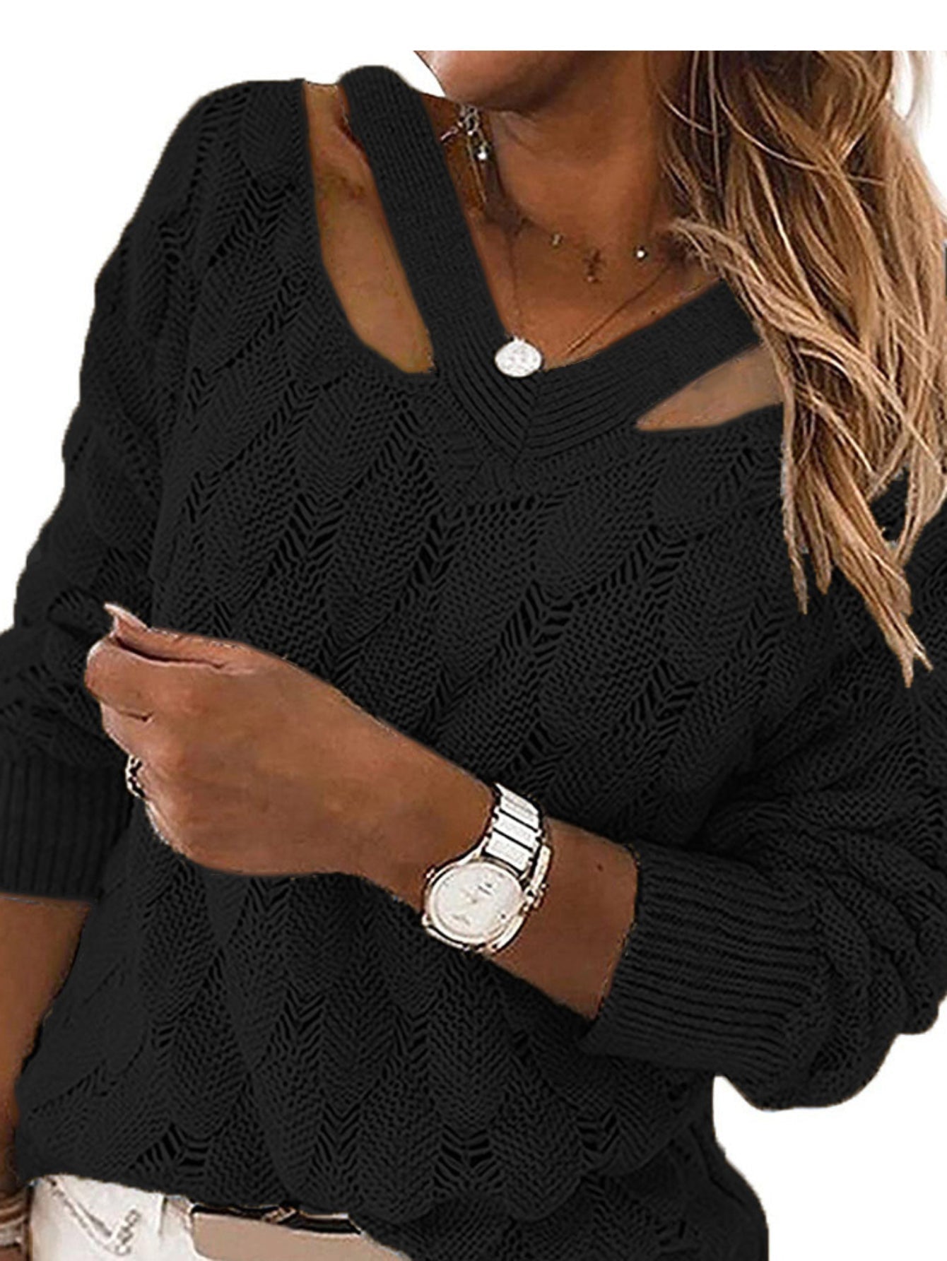 Cut Out Solid Knit Sweater, Casual V Neck Long Sleeve Sweater