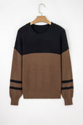 Dark Brown Color Block Knit Striped Sleeve Detail Casual Sweater
