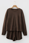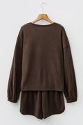 Dark Brown Solid Color Textured Knit Drop Shoulder Pullover Drawstring Shorts Set