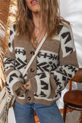 Dark Khaki Ethnic Geometric Pattern Button Front V Neck Sweater Cardigan