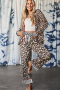 Dear Lover Khaki Leopard Print Colorblock Striped Edge Shirt and Pants Pajama Set