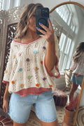 Delicacy Embroidered Flowers Colorblock Edge Hollowed Sweater