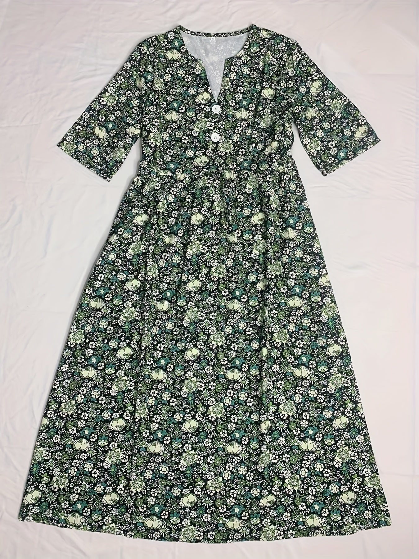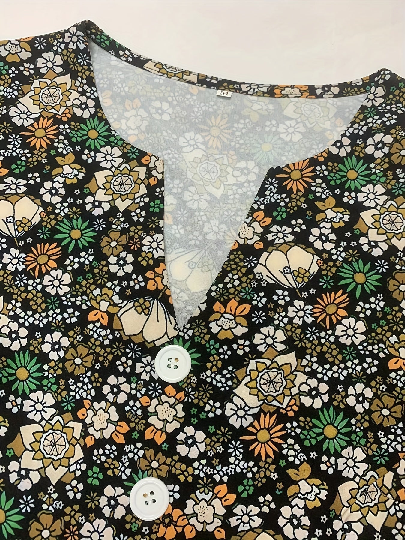 Ditsy Floral Print V Neck Dress, Casual Ruched Summer Dress With Pockets