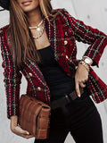 Double-breasted Notched Lapel Blazer, Elegant Plaid Tweed Long Sleeve Blazer For Office & Work