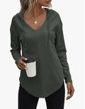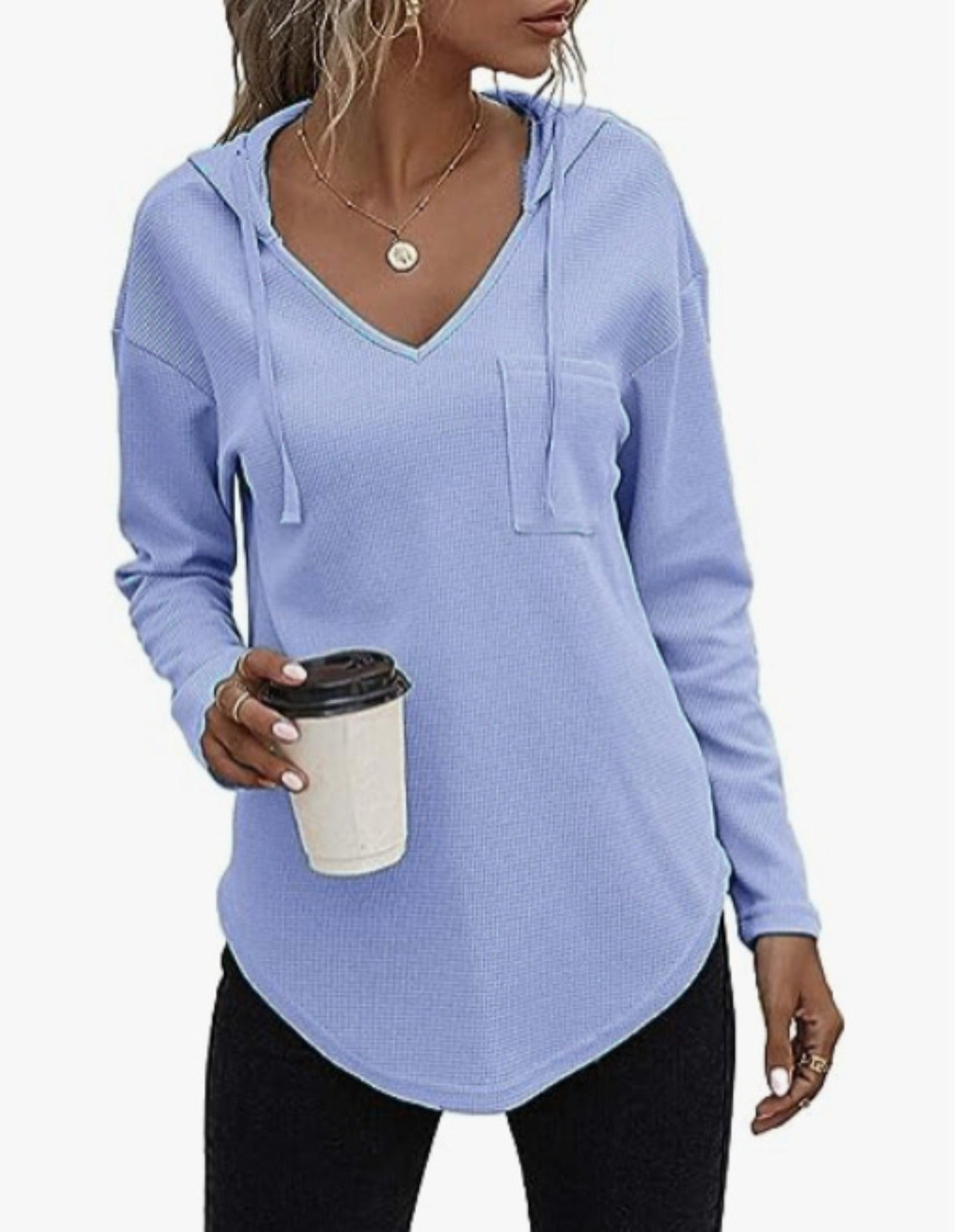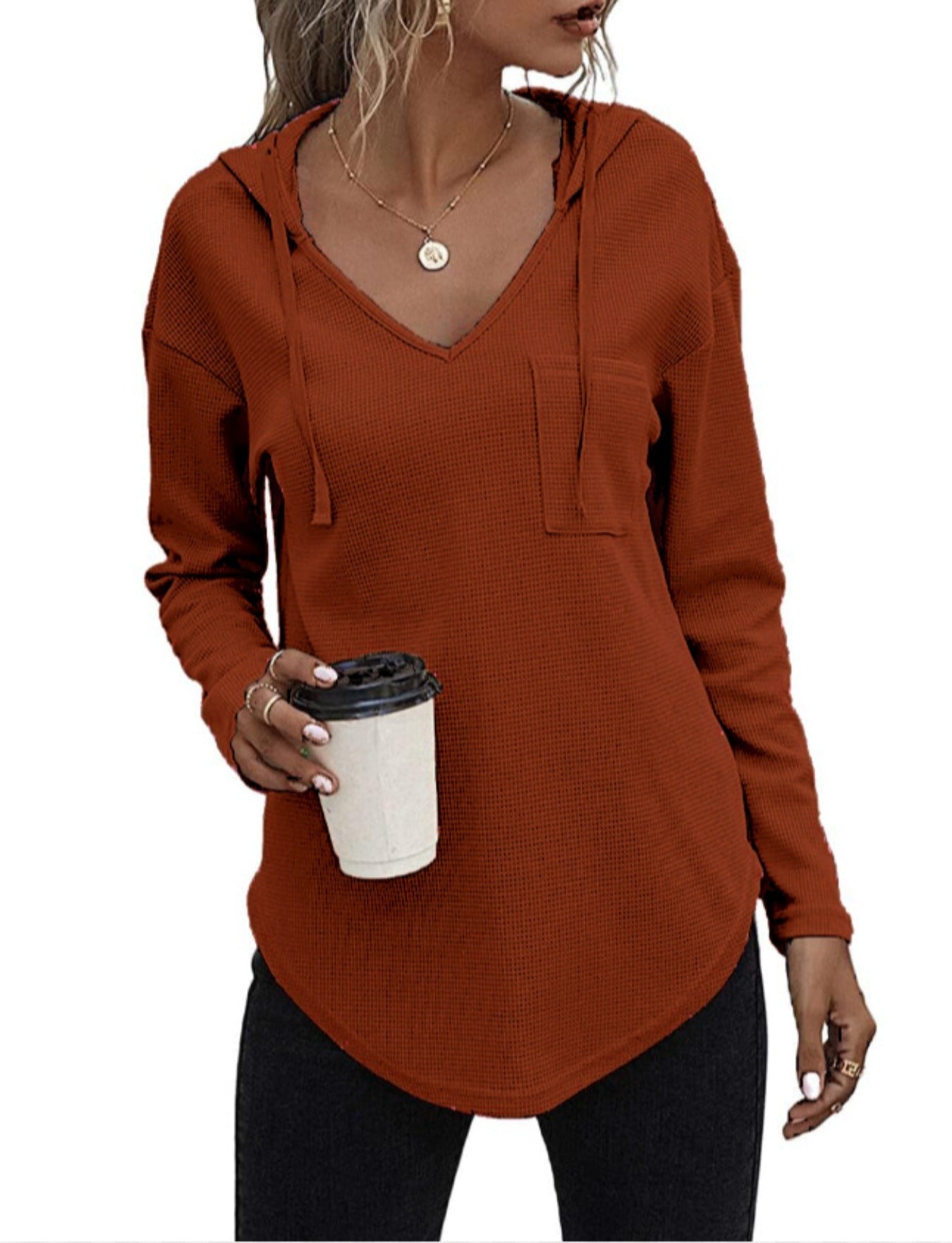 Sale Drawstring Solid Waffle Hoodies, Casual V Neck Long Sleeve Sweatshirt With Pocket