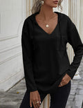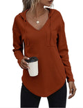 Drawstring Solid Waffle Hoodies, Casual V Neck Long Sleeve Sweatshirt With Pocket