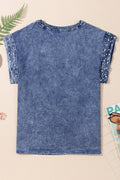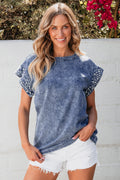 Dusk Blue Acid Wash Pearl Embellishments O-neck Denim Top