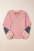 Sale Dusty Pink Floral Patchwork Textured Knit Drawstring V Neck Blouse