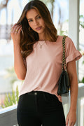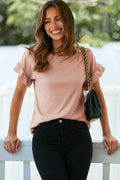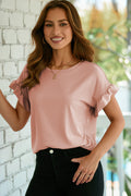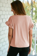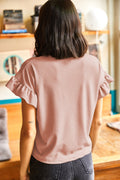 Dusty Pink Solid Color Ribbed Ruffled Short Sleeve T Shirt