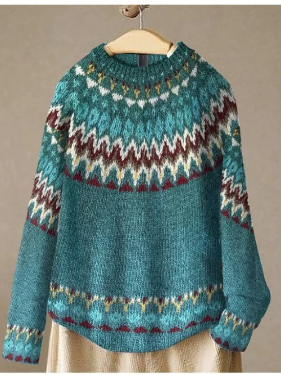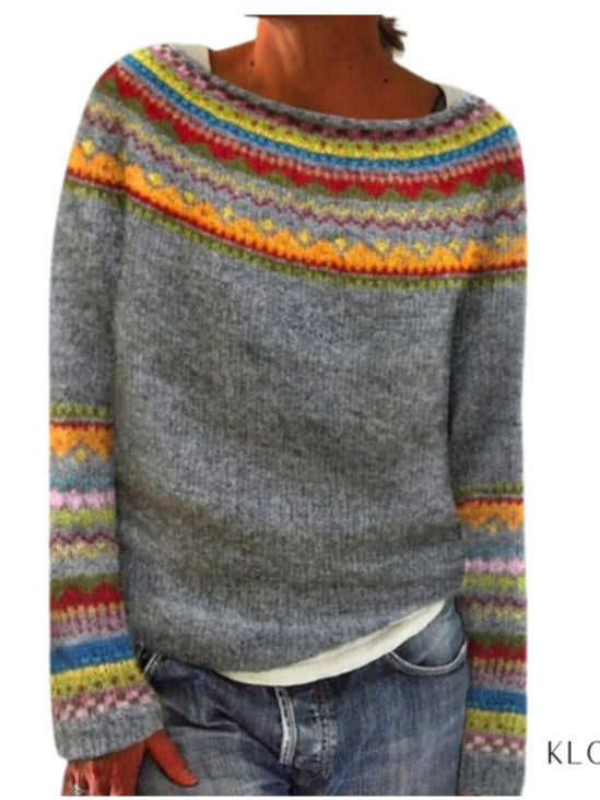 Sale Cozy Chic Knit Crew Neck Long Sleeve Pullover with Ethnic Pattern Sweater