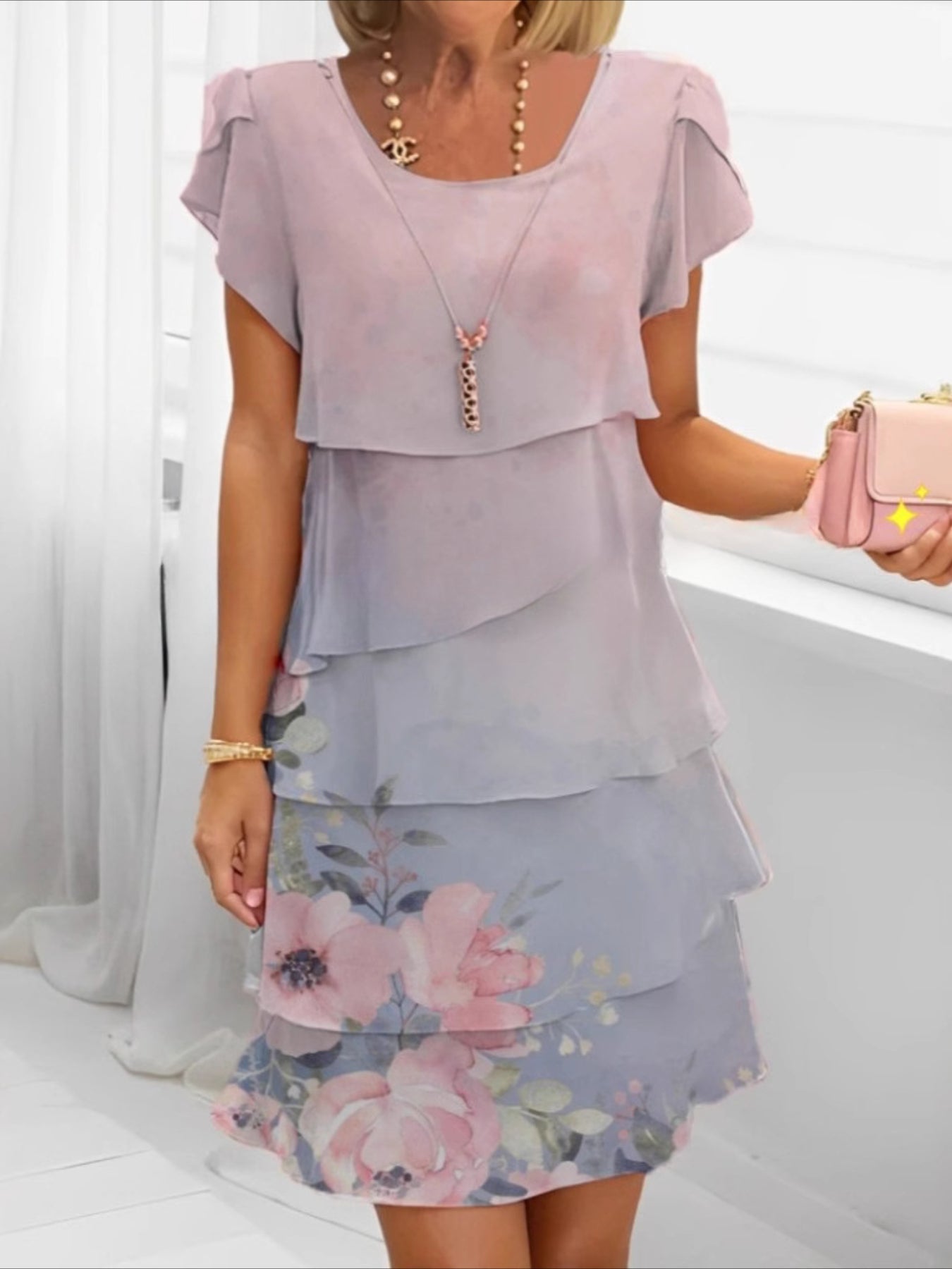 Sale Elegant Floral Print Knee-Length Short Sleeve Round Neck A-Line Dress