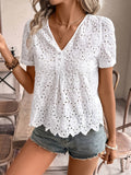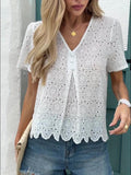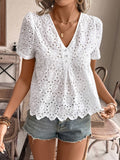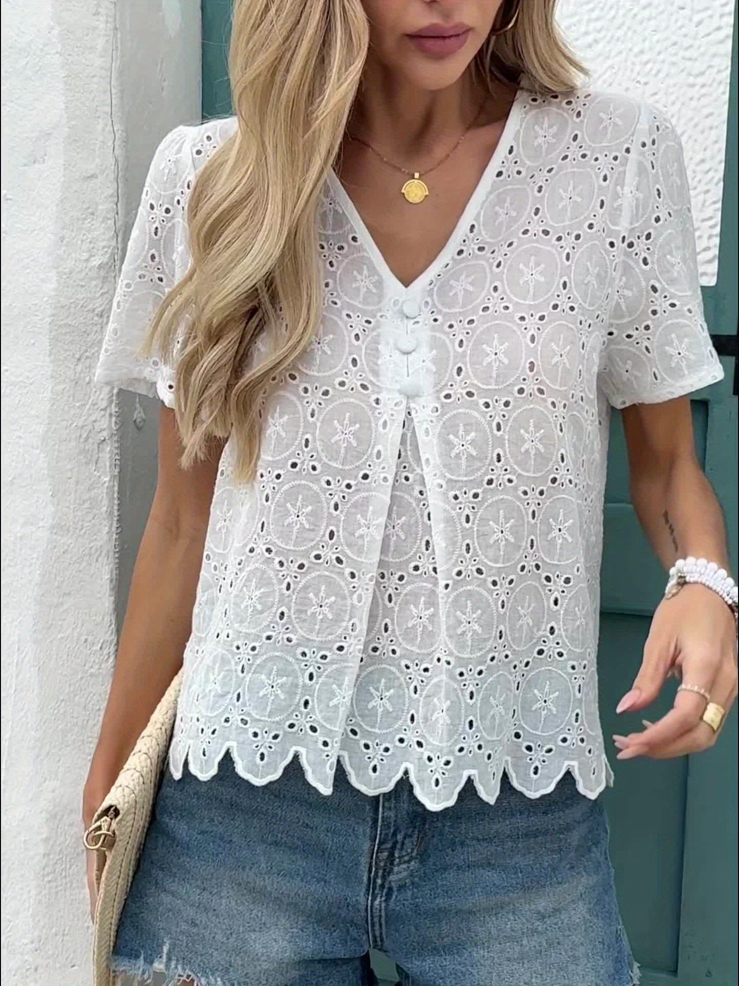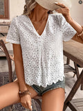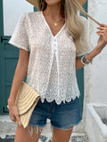 Short Sleeve Lace Detail Button-Up V-Neck Blouse with Floral Pattern
