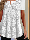 Elegant Flowers Print Solid Color Button Splicing O Neck Pullover T-Shirt