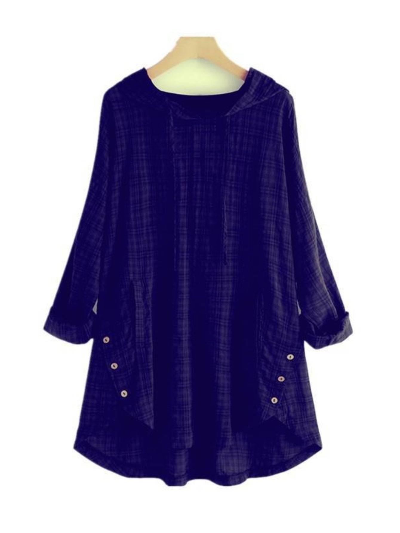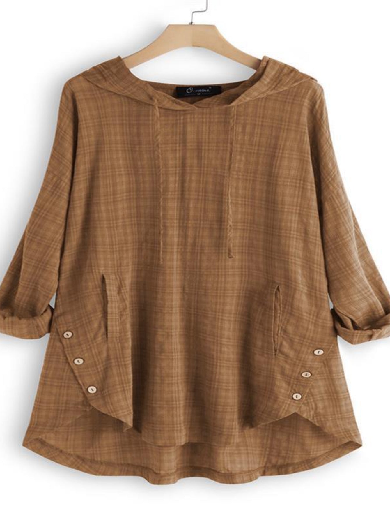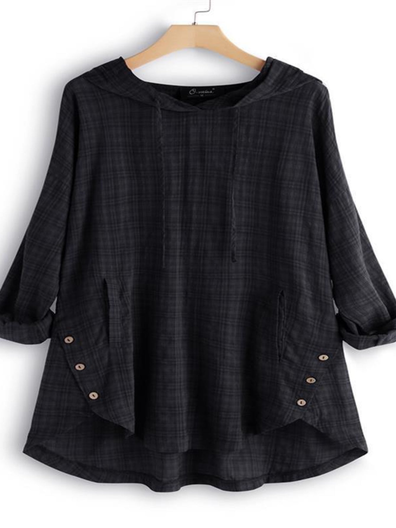 Sale Elegant Hooded Plaid Blouse for Women - Long Sleeve Shirt with Drawstring Detail